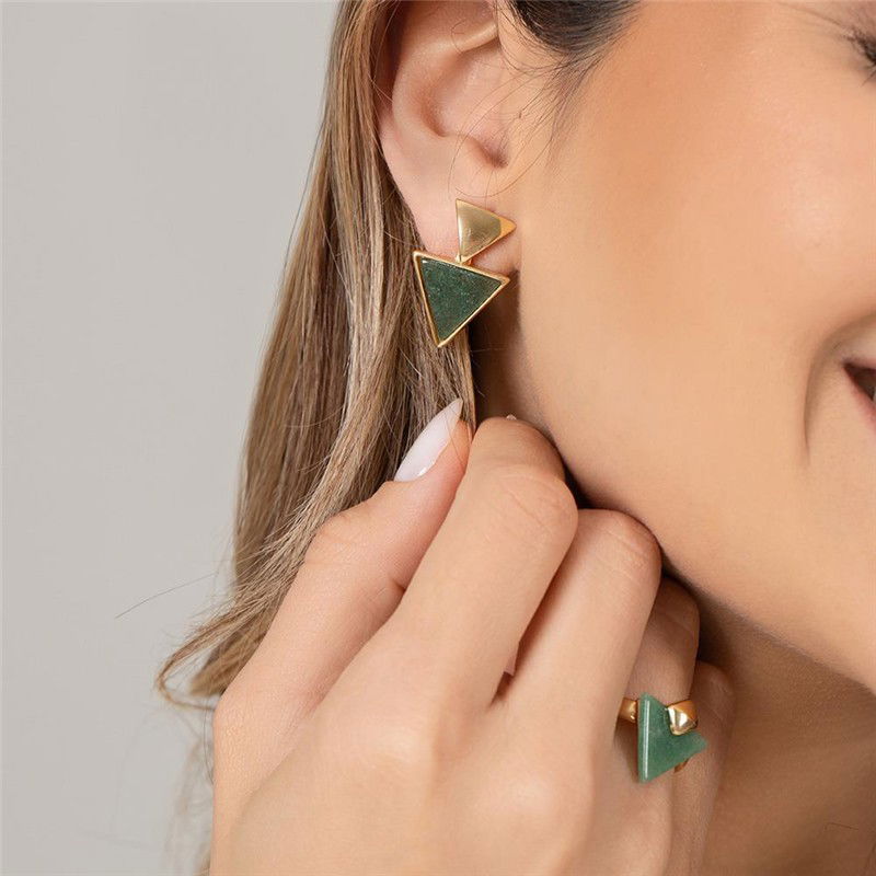 Brinco folheado a ouro da Coleção Geométrica, apresentando um elegante design com pedra em formato triangular de 12mm. Com 2,5cm de altura, oferece proporção equilibrada e sofisticada para o rosto.