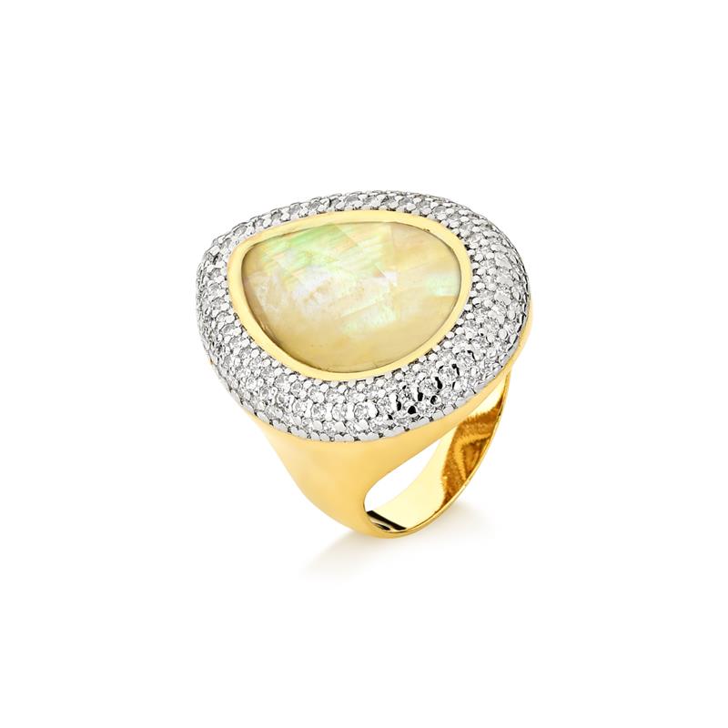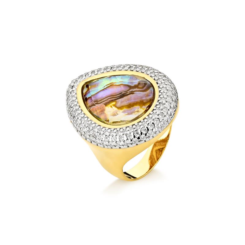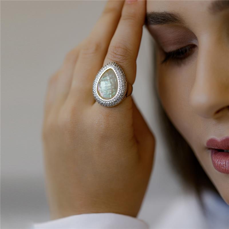 Anel sofisticado folheado a ouro e ródio branco, confeccionado em abalone e opala do mar Nautilus. A pedra em formato de gota (13x18mm) exibe o brilho natural e as cores iridescentes características da opala, criando um visual elegante e único.