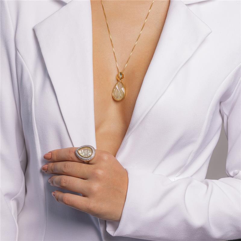 O acabamento em ródio branco proporciona durabilidade e um toque de modernidade, enquanto o folheado a ouro complementa a beleza do design. Perfeito para quem busca uma peça refinada com personalidade marcante.