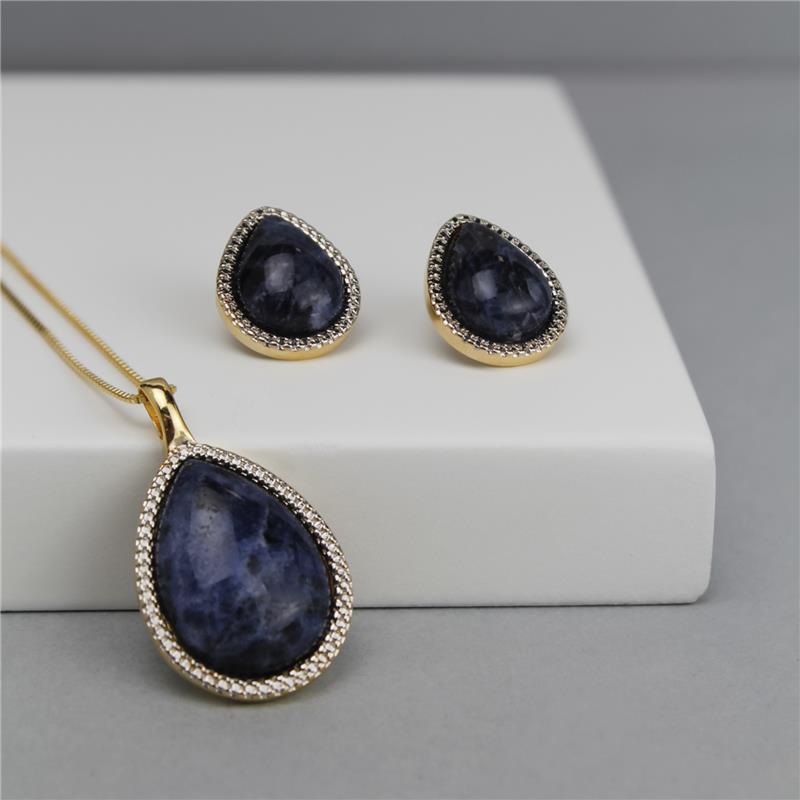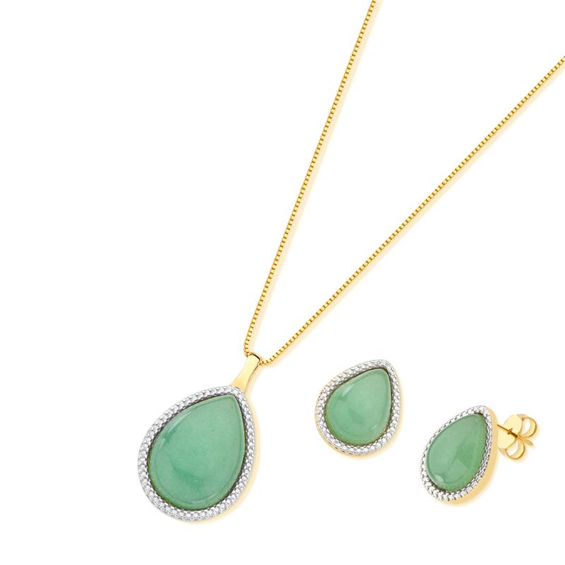 Conjunto elegante em folheado a ouro com aplicação de ródio branco, composto por brinco, pingente e colar. Os brincos apresentam cabochão gota de 10x14mm com altura de 2cm, enquanto o pingente destaca-se com pedra cabochão gota de 16x22mm e 3,5cm de comprimento.