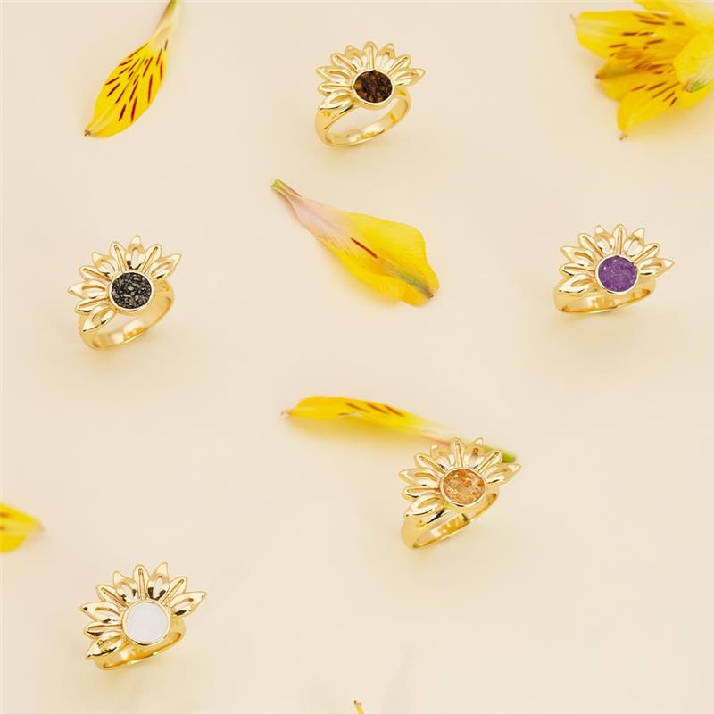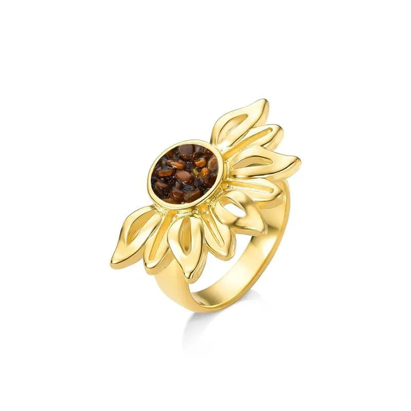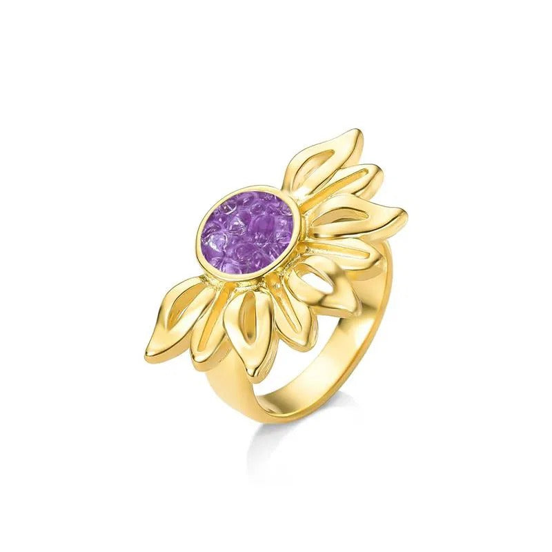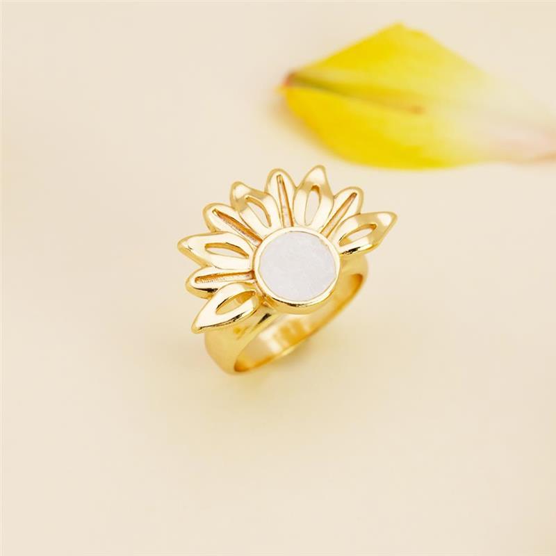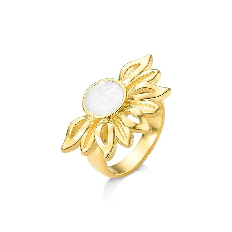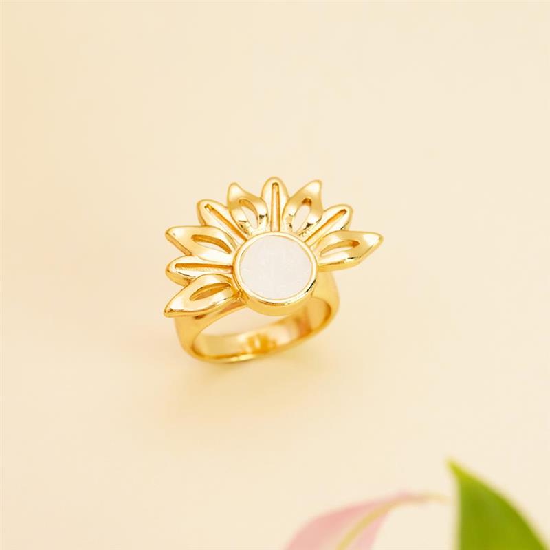 Descubra a luminosidade do ANEL FOLHEADO A OURO da Coleção Girassol. Inspirado na flor que segue a luz, este anel combina elegância com significado profundo. Seu design marcante apresenta pedras naturais fragmentadas no centro, cercadas por pedras em formato de navete que evocam as pétalas delicadas do girassol.