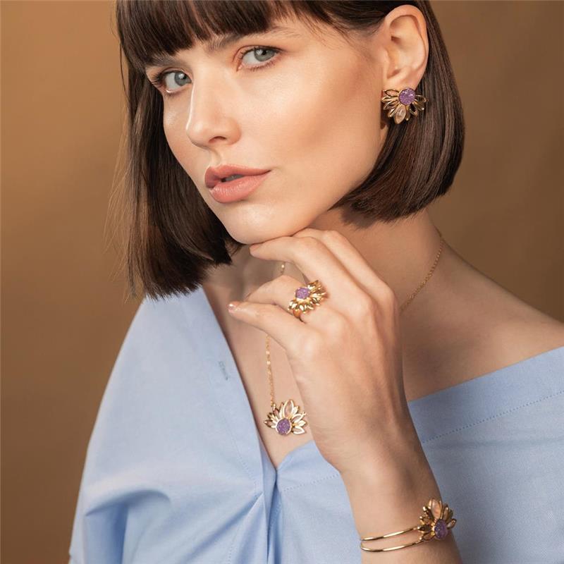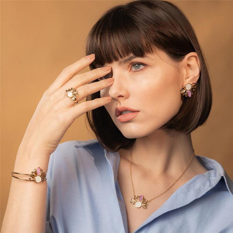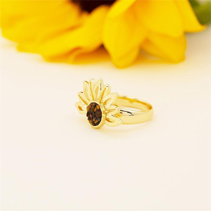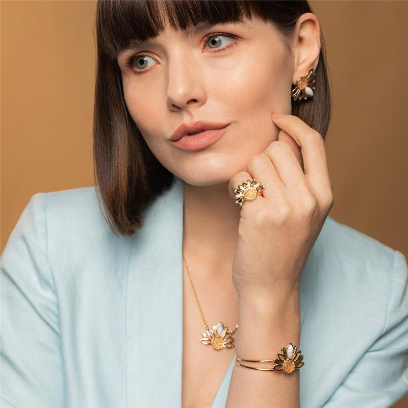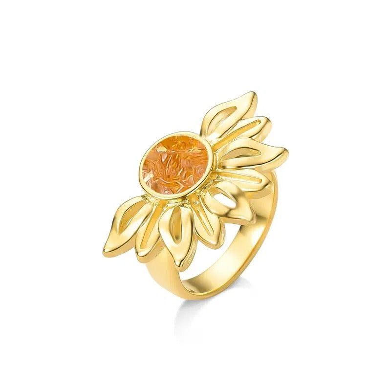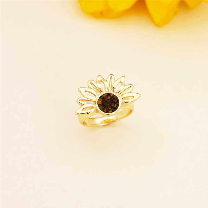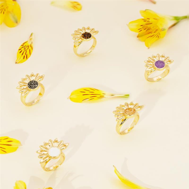 Descubra a luminosidade do ANEL FOLHEADO A OURO da Coleção Girassol. Inspirado na flor que segue a luz, este anel combina elegância com significado profundo. Seu design marcante apresenta pedras naturais fragmentadas no centro, cercadas por pedras em formato de navete que evocam as pétalas delicadas do girassol.