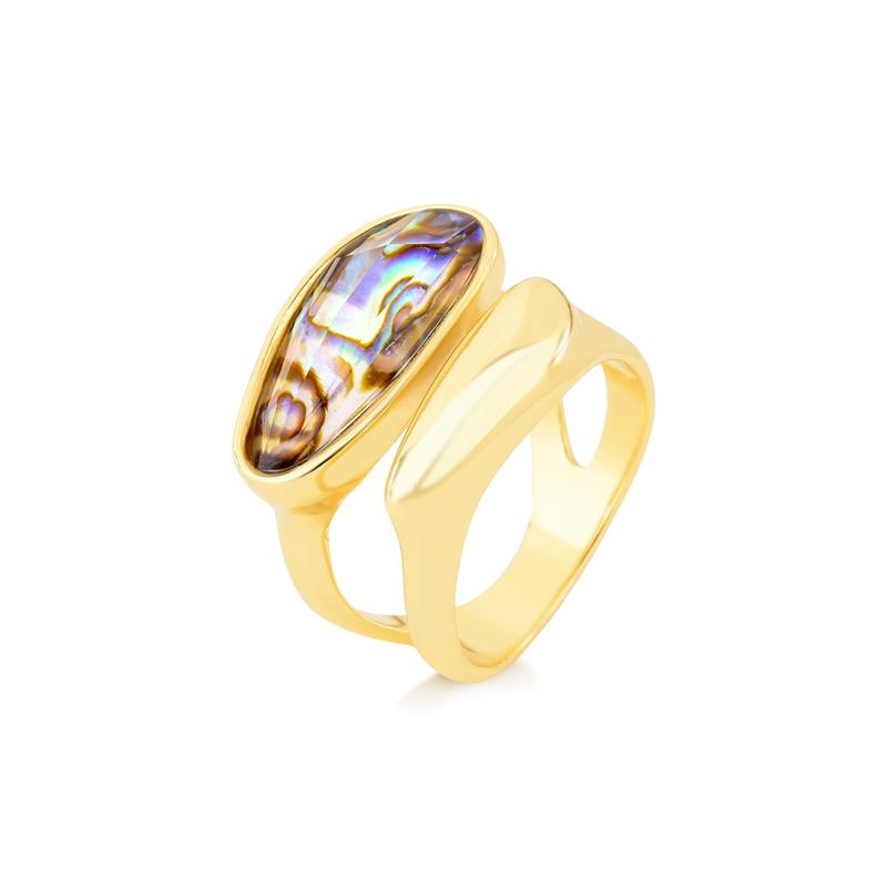 Sofisticação geométrica encontra elegância natural neste anel que celebra a beleza do abalone. A pedra em formato de triângulo escaleno facetado (9x18mm) captura luz de forma única, revelando os tons iridescentes característicos do abalone em cada movimento do pulso.