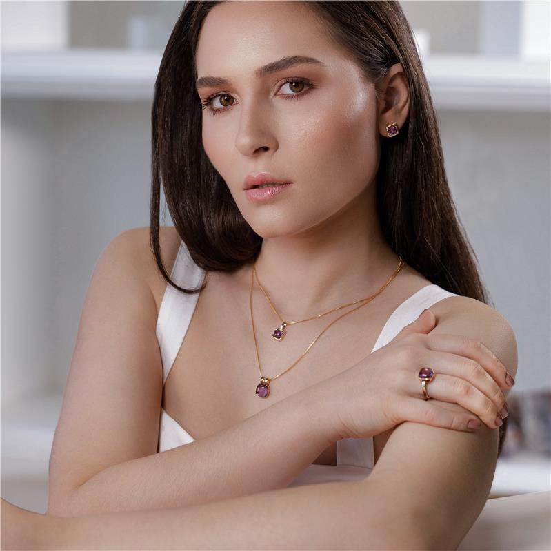 Descubra a elegância e a espiritualidade em um único acessório. Este anel folheado a ouro apresenta uma magnífica ametista em formato cabochão quadrado (10x10mm), unindo sofisticação moderna com propriedades energéticas milenares. A ametista é reconhecida como símbolo de sabedoria, equilíbrio e proteção, atuando como ponte entre o físico e o astral.