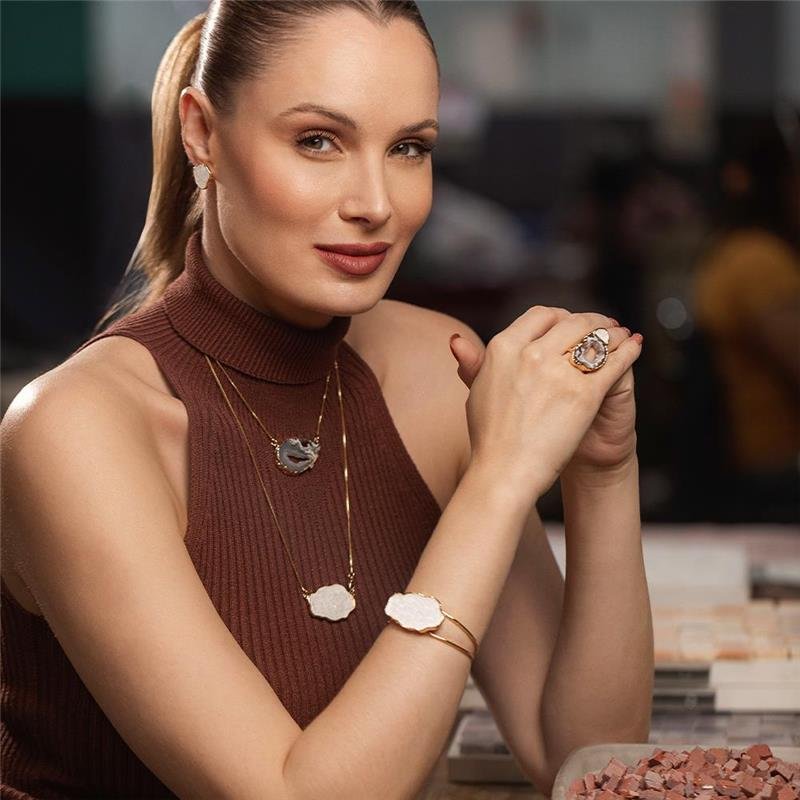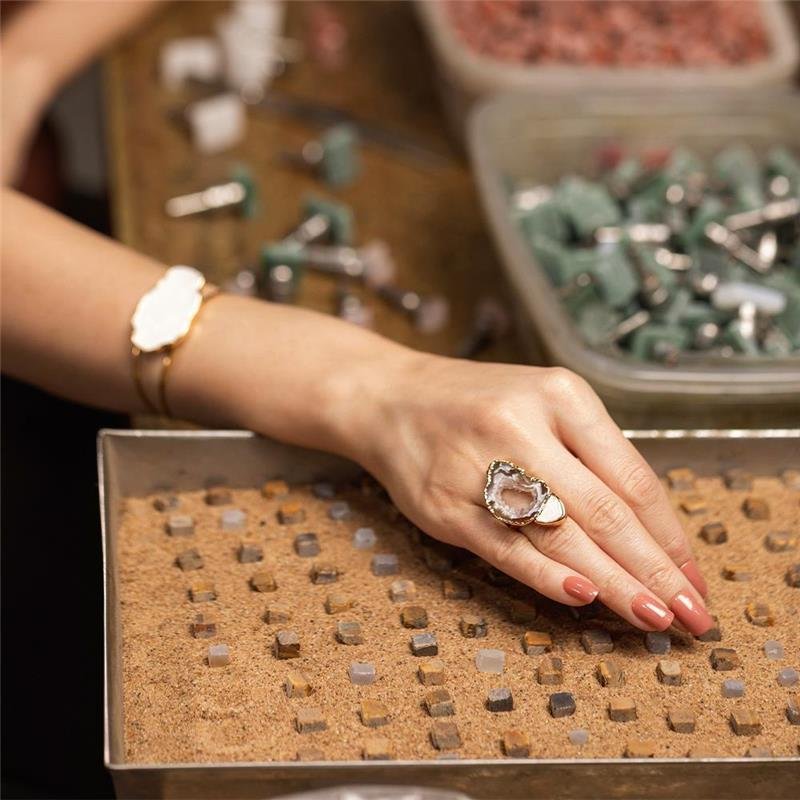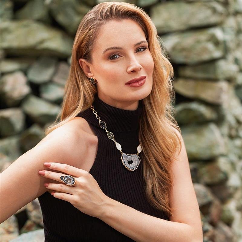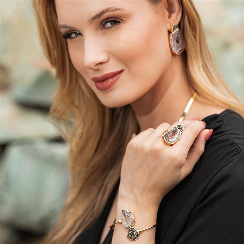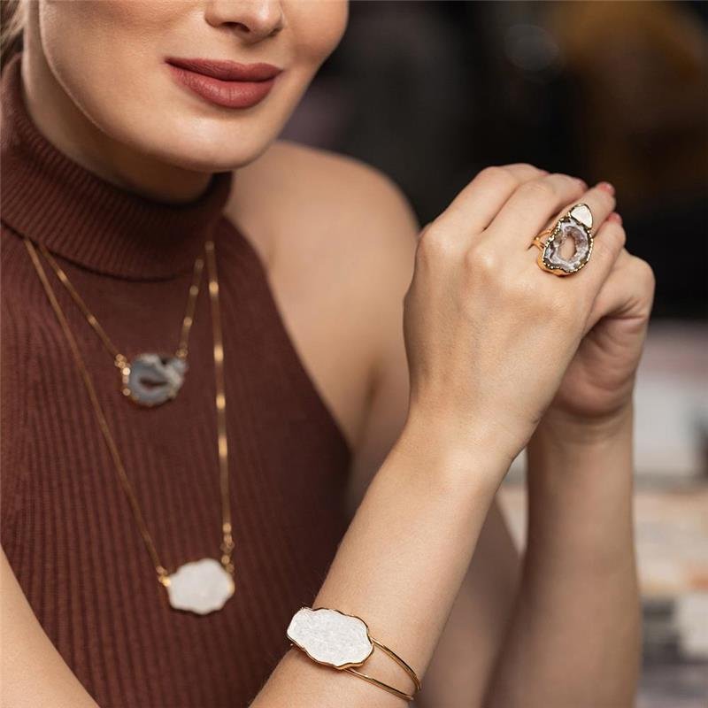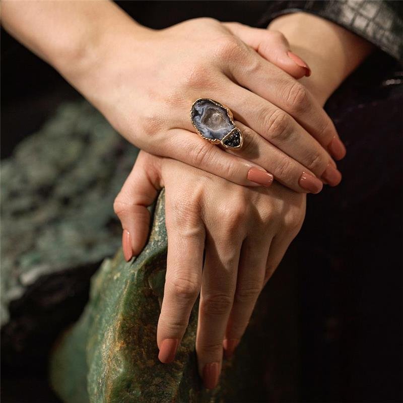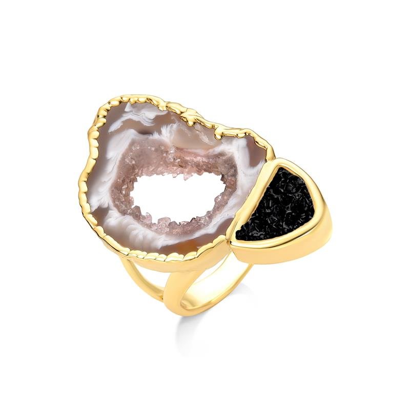 Anel em ouro folheado que celebra a beleza bruta da natureza. Cada peça apresenta geodos autênticos com formações de drusa e fragmentos de pedra natural, extraídos do interior de ágatas genuínas. As variações naturais de tonalidade do mais claro ao mais escuro garantem que você possua uma criação verdadeiramente única.