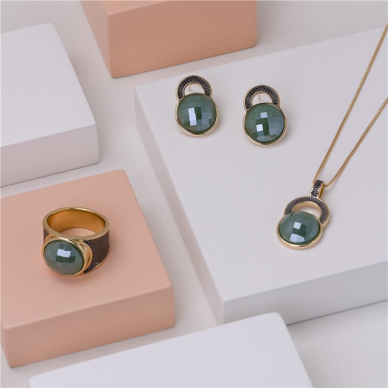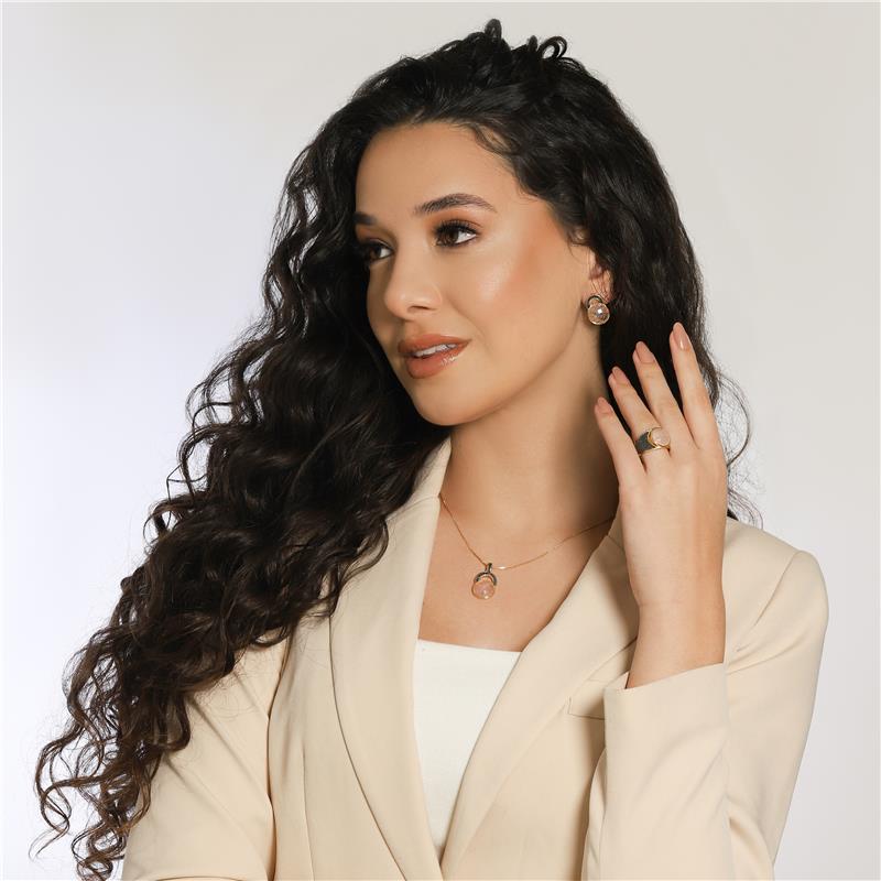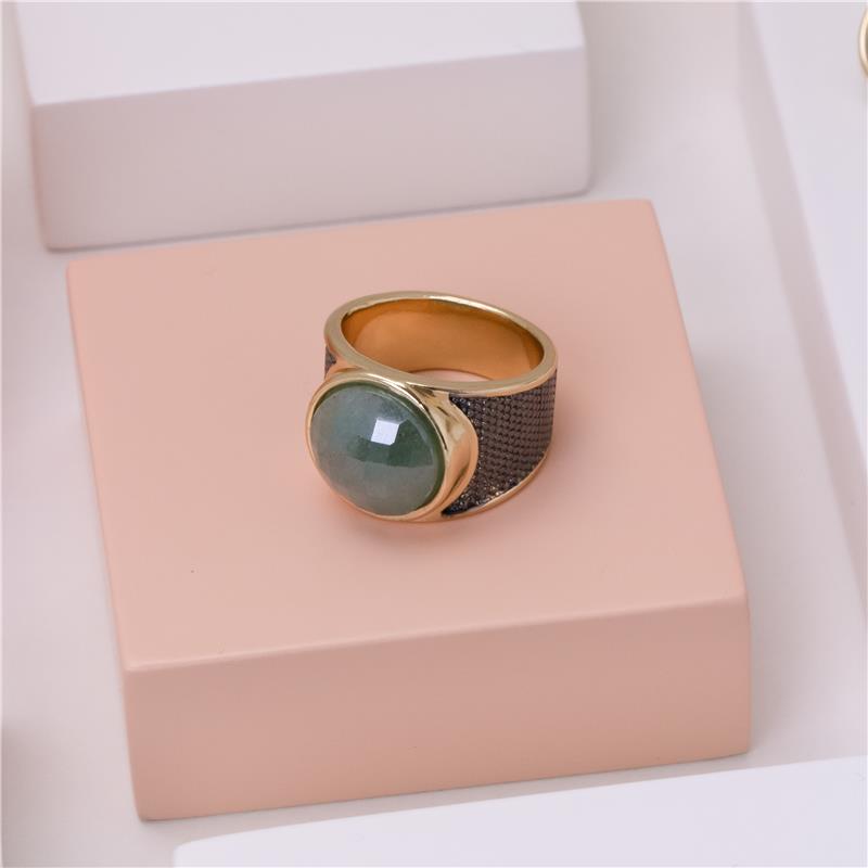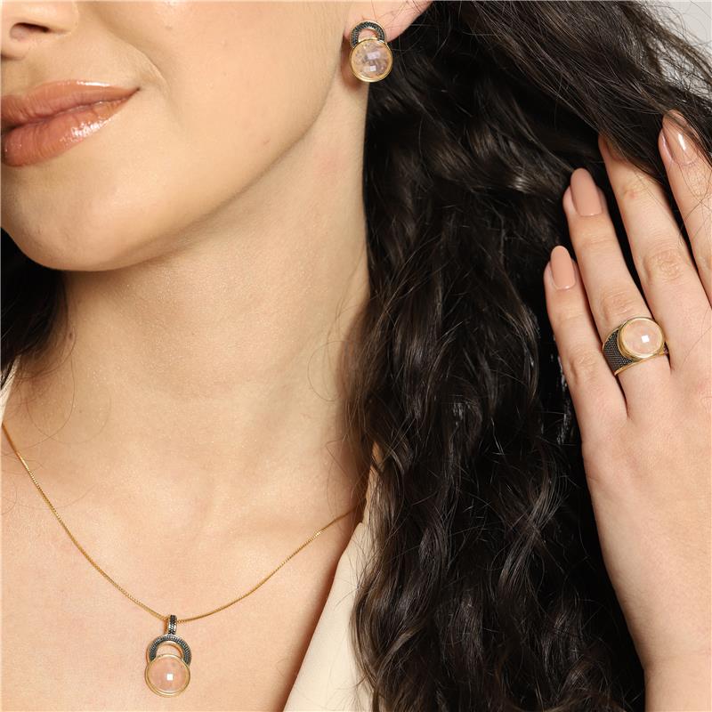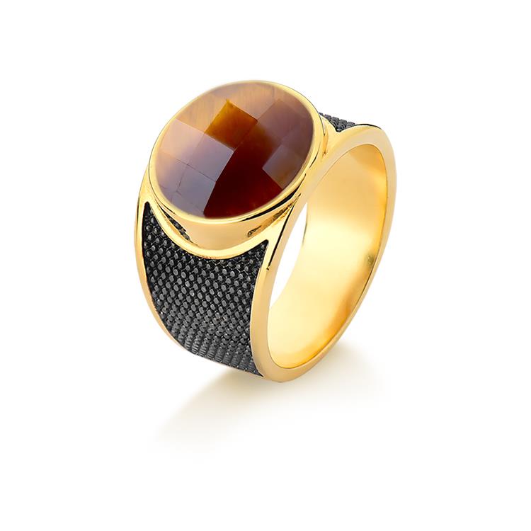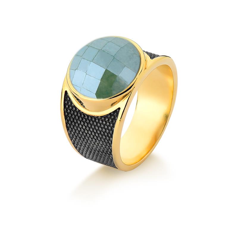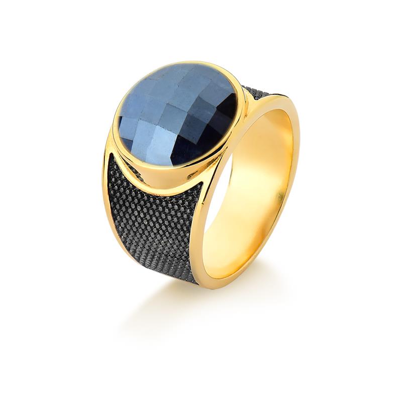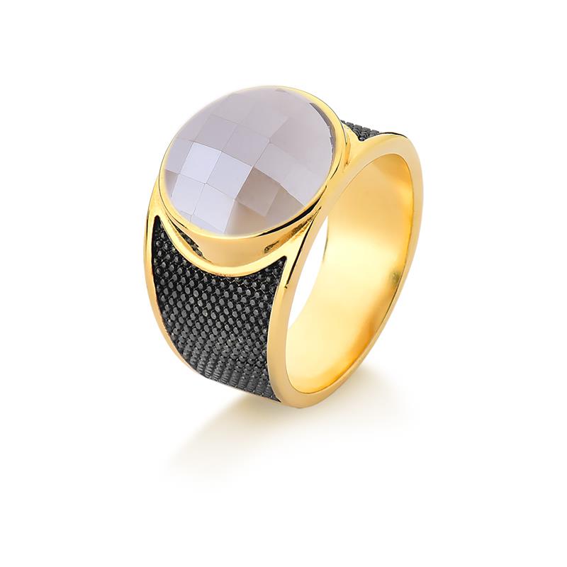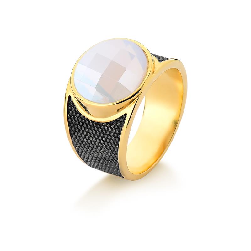 Sofisticação em cada detalhe. Este anel folheado a ouro traz uma pedra natural facetada de 12mm com acabamento perolado que captura luz de forma única. Os traços precisos em ródio negro complementam o design, criando contraste elegante entre o brilho dourado e a profundidade do metal escuro.