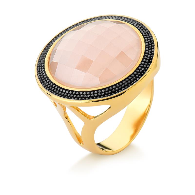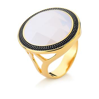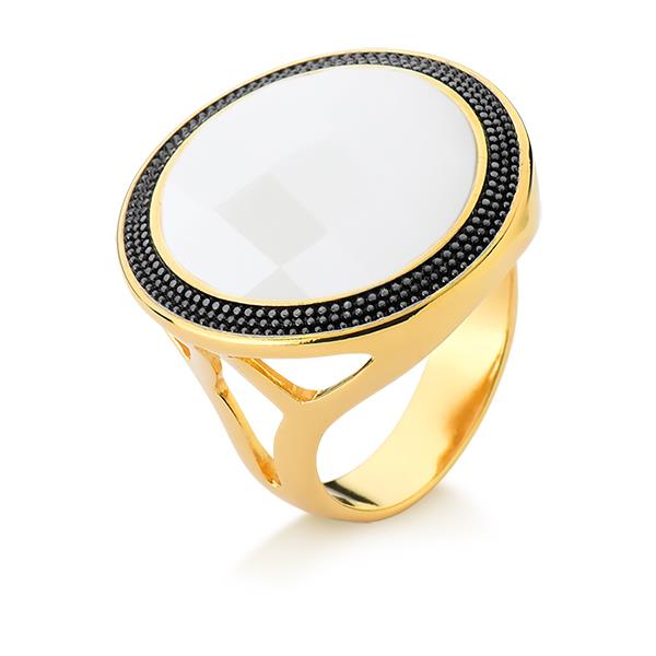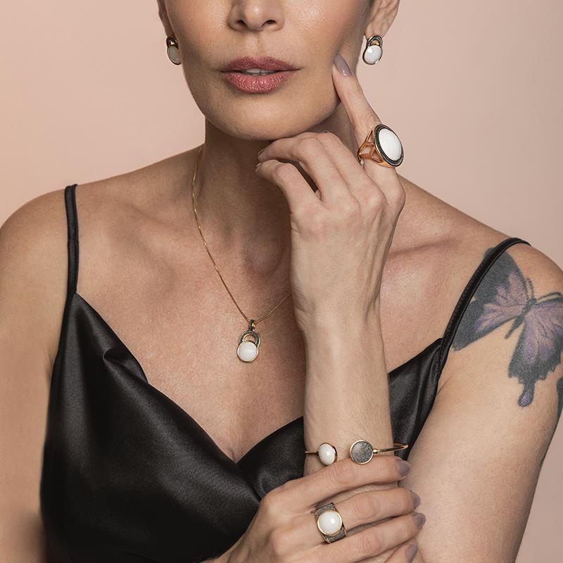 Descubra a elegância sofisticada do Anel Folheado a Ouro e Ródio Negro da Coleção Facetada Perolada. Este anel une o brilho atemporal do ouro com o contraste moderno do ródio negro, criando uma peça que transcende tendências. A pedra natural facetada de 20mm em formato redondo é o destaque principal, apresentando um efeito perolado que captura a luz de forma única e envolvente.