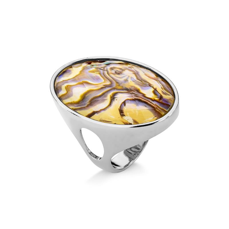 O formato oval generoso (20x30mm) garante presença marcante no dedo, enquanto os detalhes vazados na lateral adicionam leveza e movimento. Folheado a ródio, oferece durabilidade e brilho duradouro. Uma peça versátil que transita do dia para a noite, perfeita para quem busca acessórios com personalidade e refinamento.
