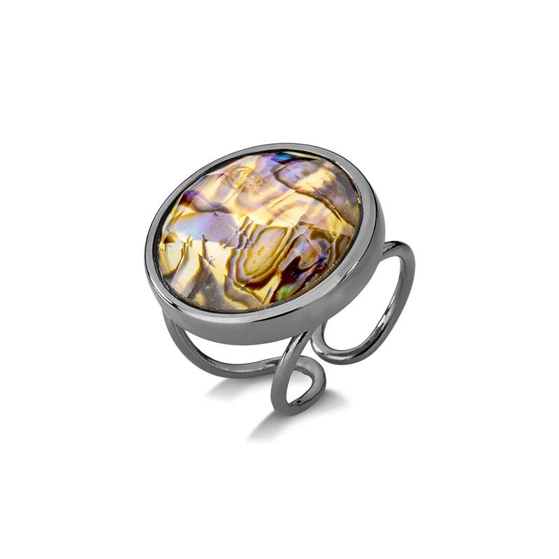 Anel Folheado a Ródio Negro com Abalone Sofisticação em cada detalhe. Este anel combina o acabamento nobre do folheado a ródio negro com a beleza natural do abalone, criando uma peça que transcende tendências. O contraste entre o brilho metálico e o iridescente da madrepérola revela uma elegância atemporal, perfeita para quem compreende que verdadeiro luxo está na harmonia entre materiais refinados.