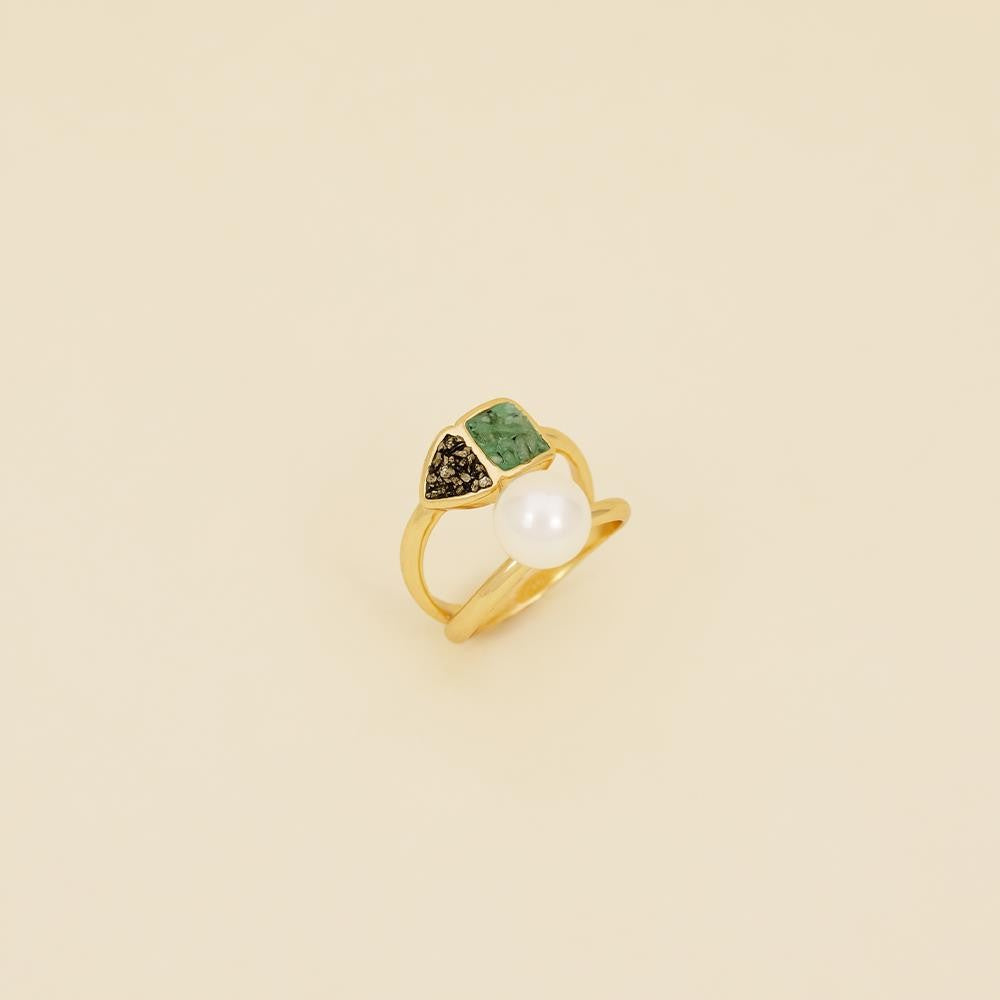 Anel Possebon Folheado a Ouro - Coleção Afeto Elegância que sussurra. Este anel traz uma pérola shell de 10mm em destaque, cercada por fragmentos de pedras naturais que criam um efeito sofisticado e contemporâneo. O folheado a ouro realça cada detalhe, transformando a peça em um acessório versátil que se adapta a qualquer momento.