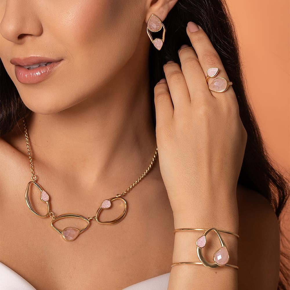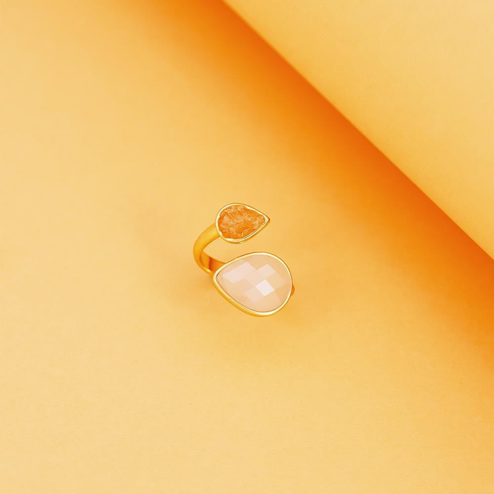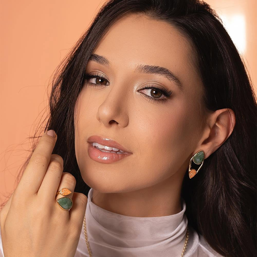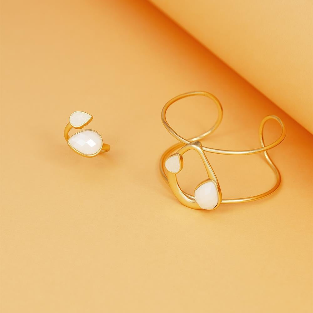 Descubra a elegância fluida da Coleção Duna. Este anel folheado a ouro une linhas curvas e estruturadas com texturas que contrastam perfeitamente, criando movimento a cada gesto. A gota facetada perolada de 10x14 mm é complementada por pedras fragmentadas que capturam a luz de forma única.