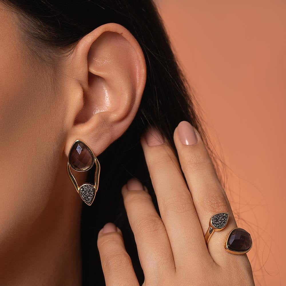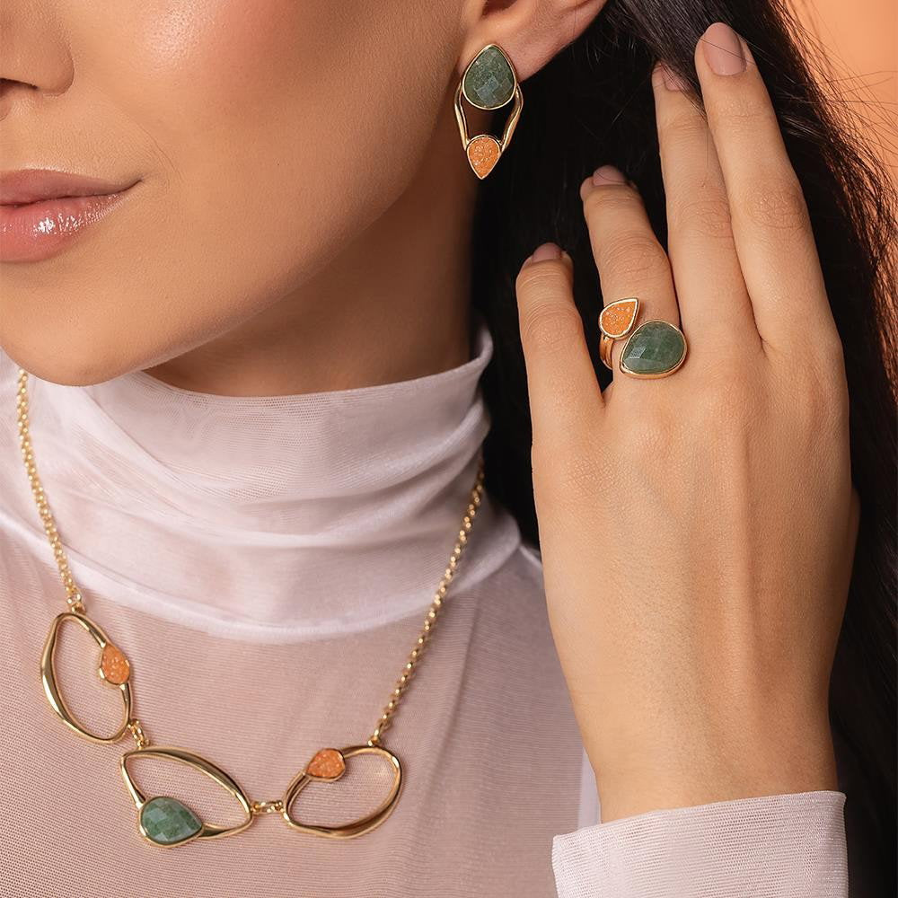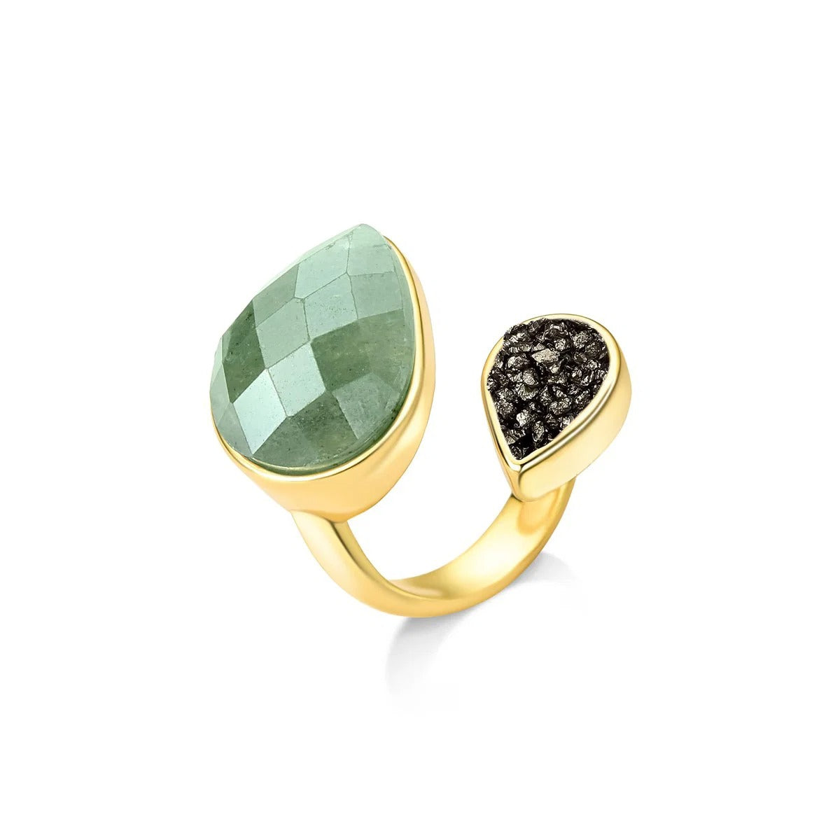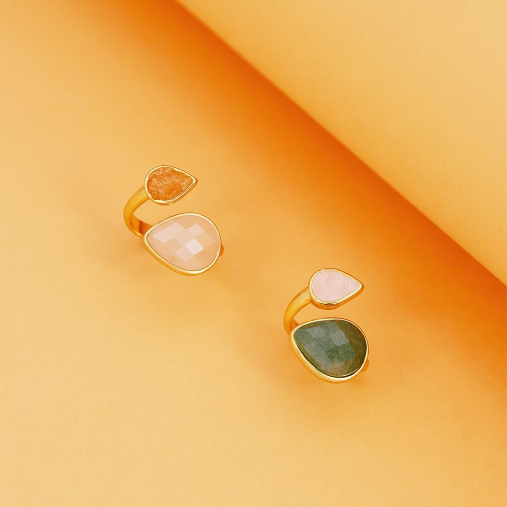 Descubra a elegância fluida da Coleção Duna. Este anel folheado a ouro une linhas curvas e estruturadas com texturas que contrastam perfeitamente, criando movimento a cada gesto. A gota facetada perolada de 10x14 mm é complementada por pedras fragmentadas que capturam a luz de forma única.
