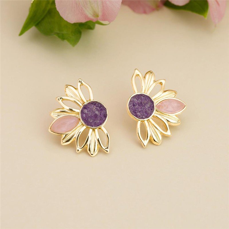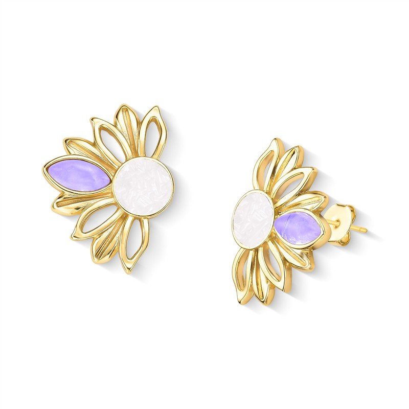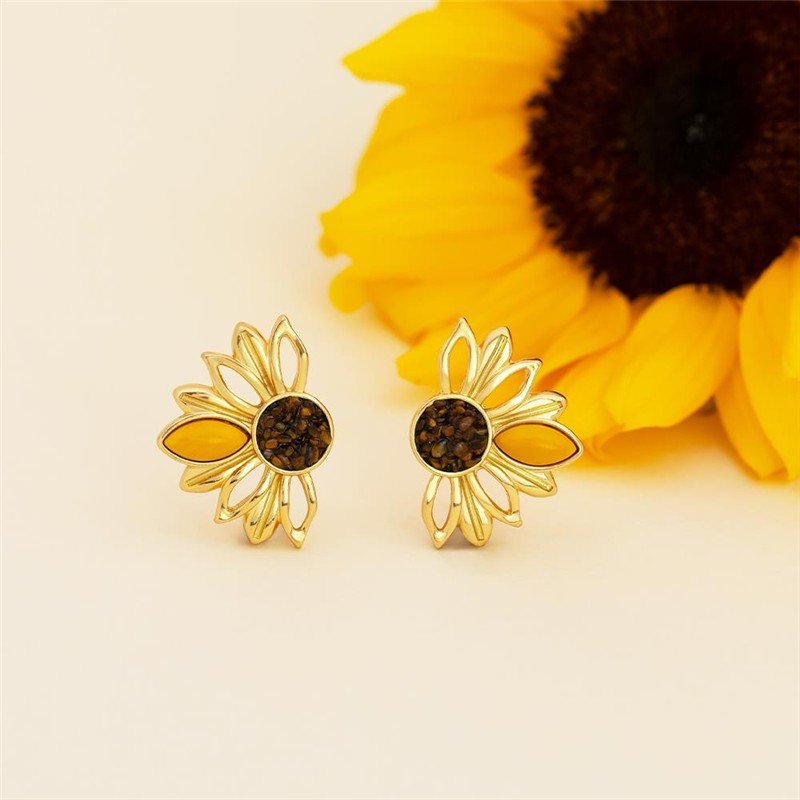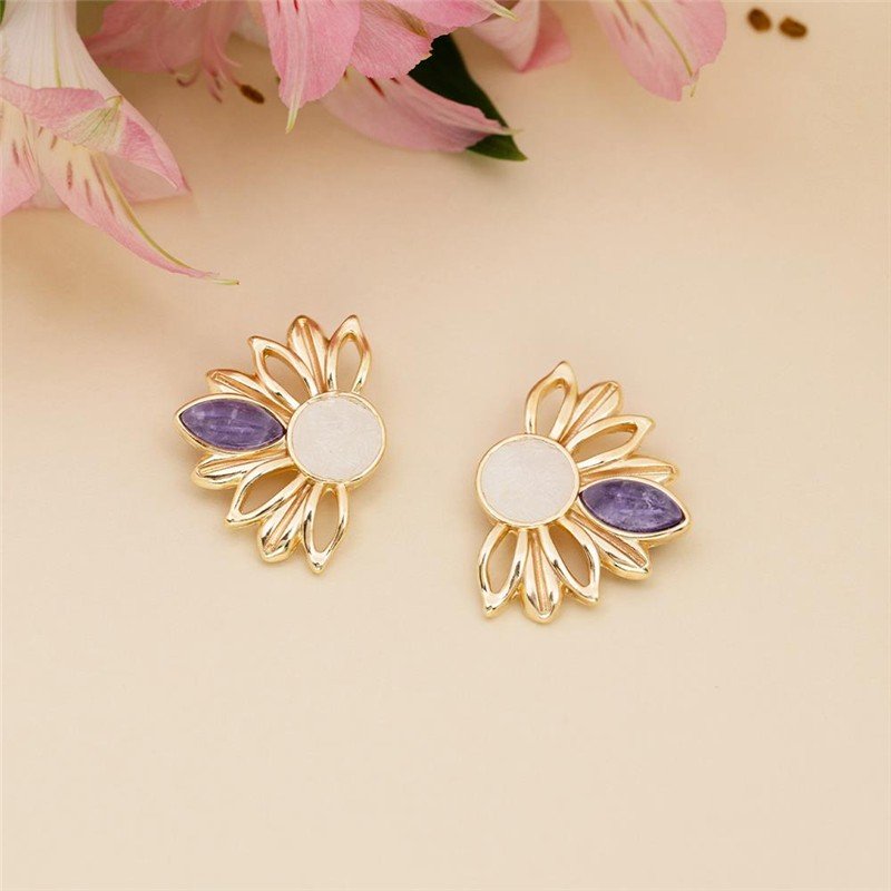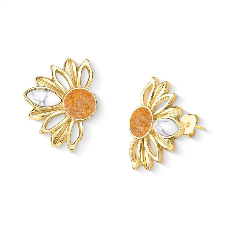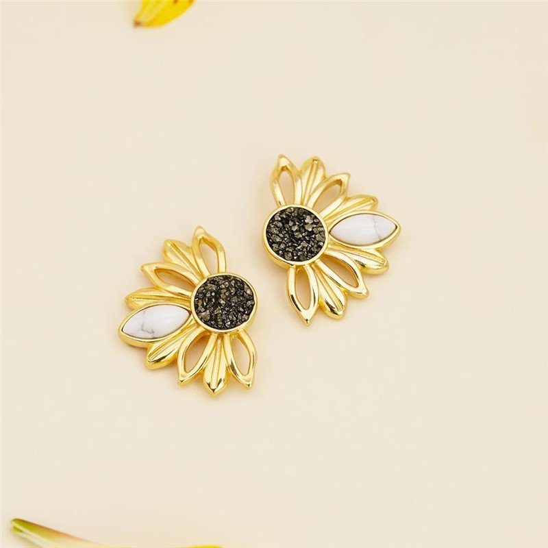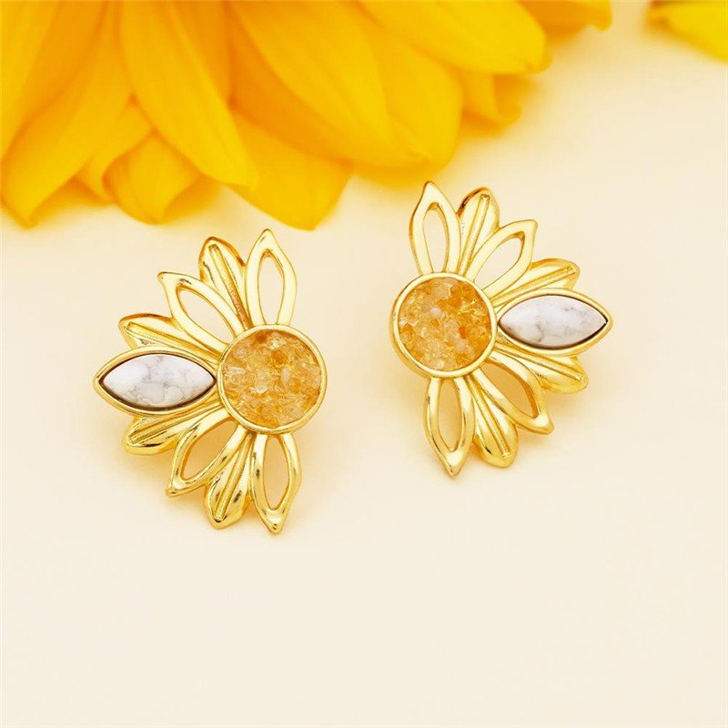 BRINCO FOLHEADO A OURO - COLEÇÃO GIRASSOL Celebre a vitalidade e a renovação com este brinco que homenageia a beleza do girassol. Medindo 3,3cm de altura, a peça apresenta uma composição sofisticada: pedra cabochão navete de 6x12mm acompanhada por fragmentos de pedra natural que formam o centro, evocando as pétalas características da flor.