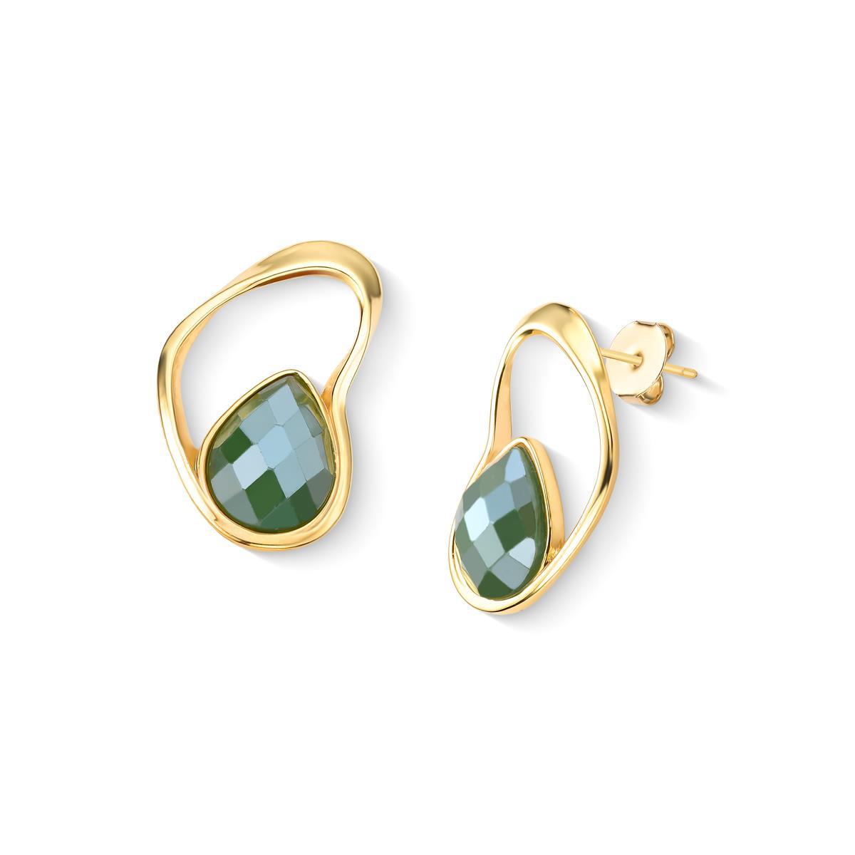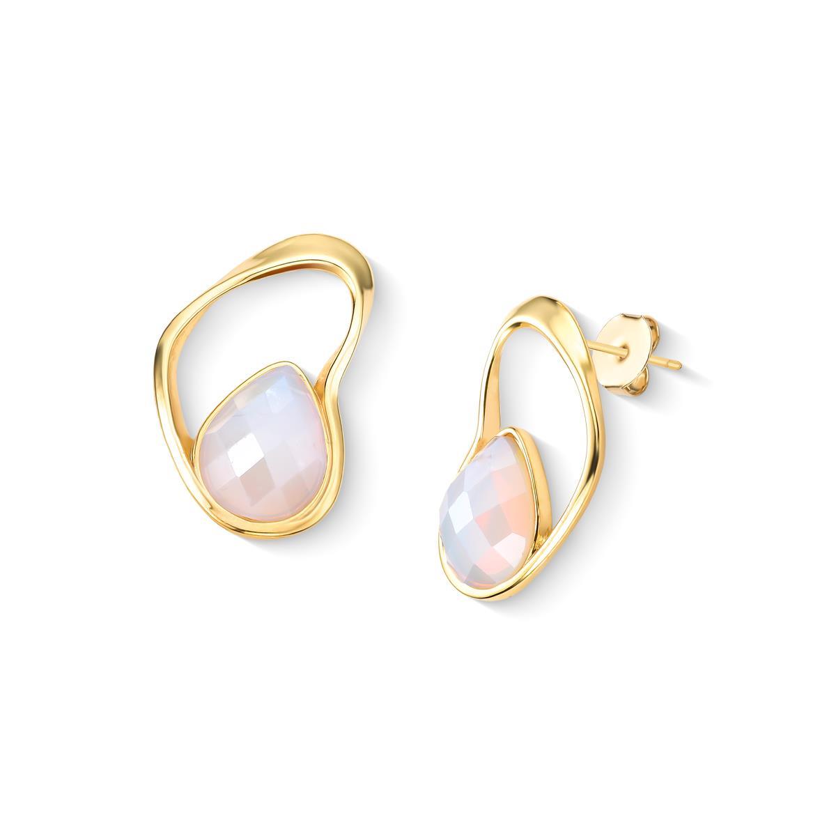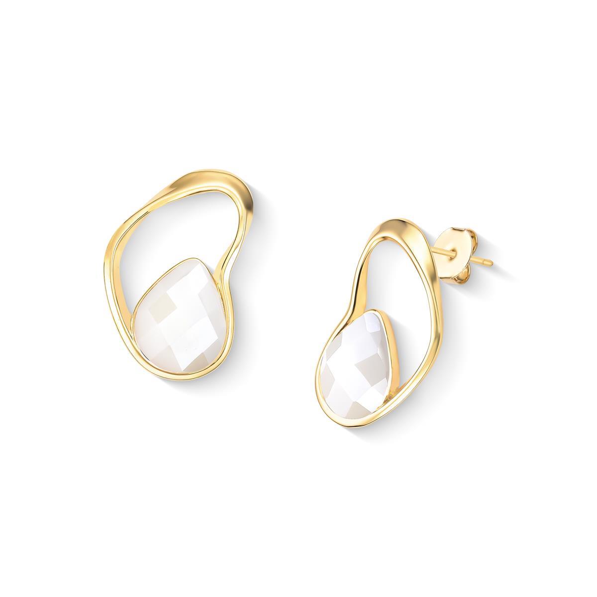 Coleção Acqua Luna: brinco folheado a ouro com altura de 3,2 cm e pedra facetada em formato de gota (10x14mm). Inspirado na harmonia entre o mar e a lua, cada peça apresenta design orgânico que reflete luz como o brilho lunar sobre o oceano. As pedras peroladas facetadas foram selecionadas para capturar essa luminosidade característica.
