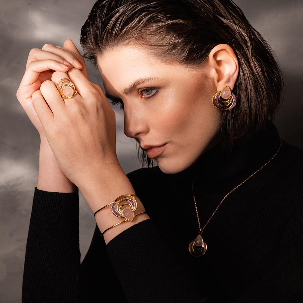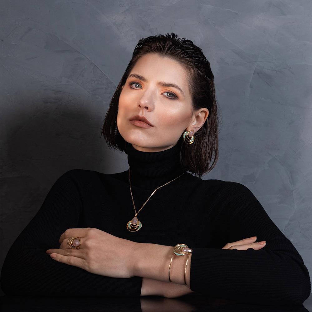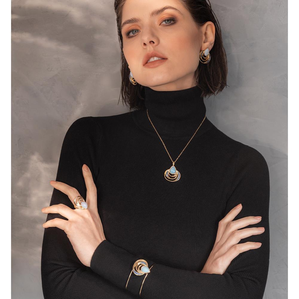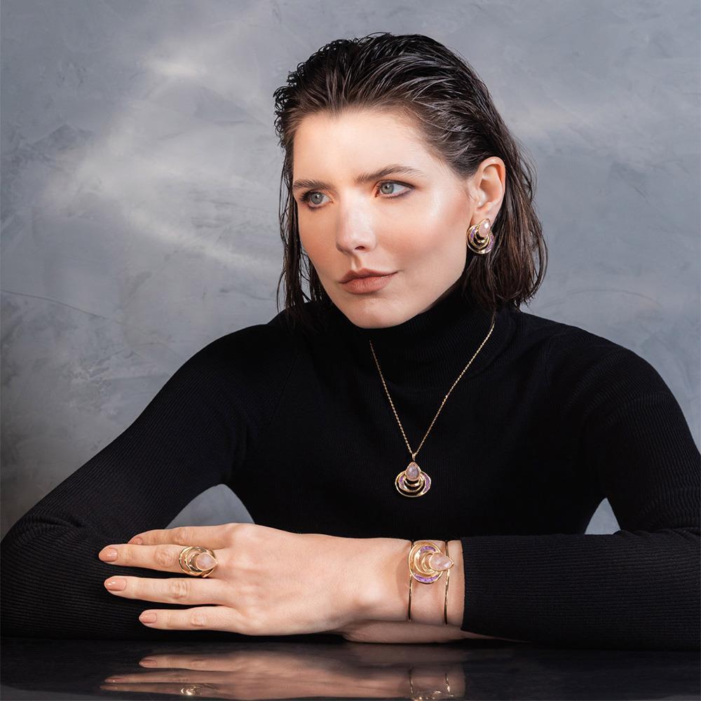 As pedras peroladas refletem luminosidade similar ao luar sobre o mar, enquanto a estrutura orgânica evoca transformação e poder interior. Uma peça que transcende o adorno, carregando narrativa poética e propósito simbólico para quem a usa.