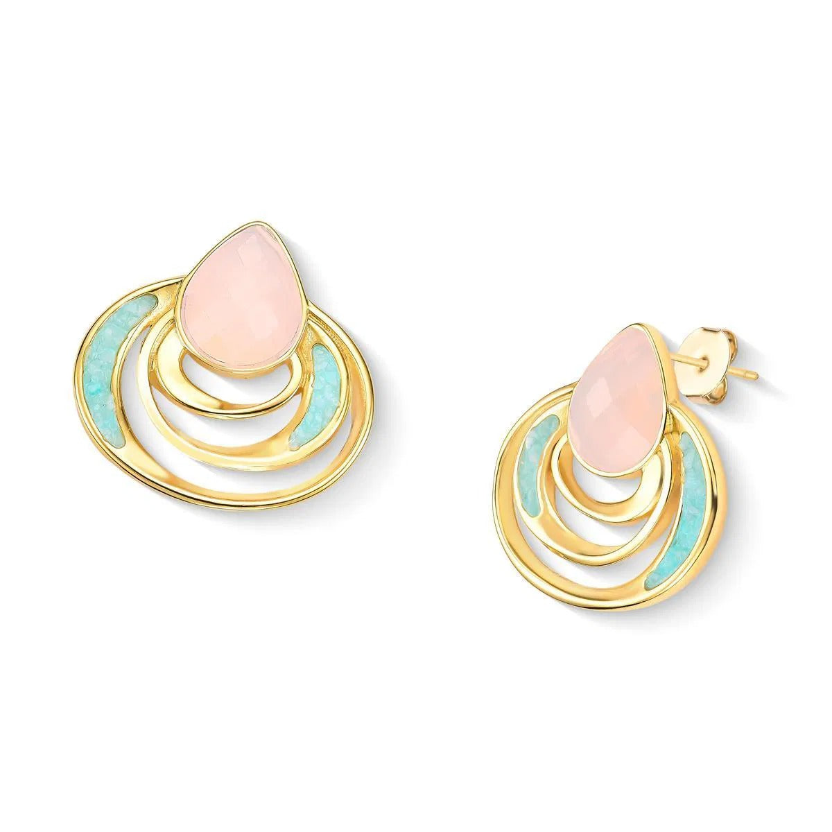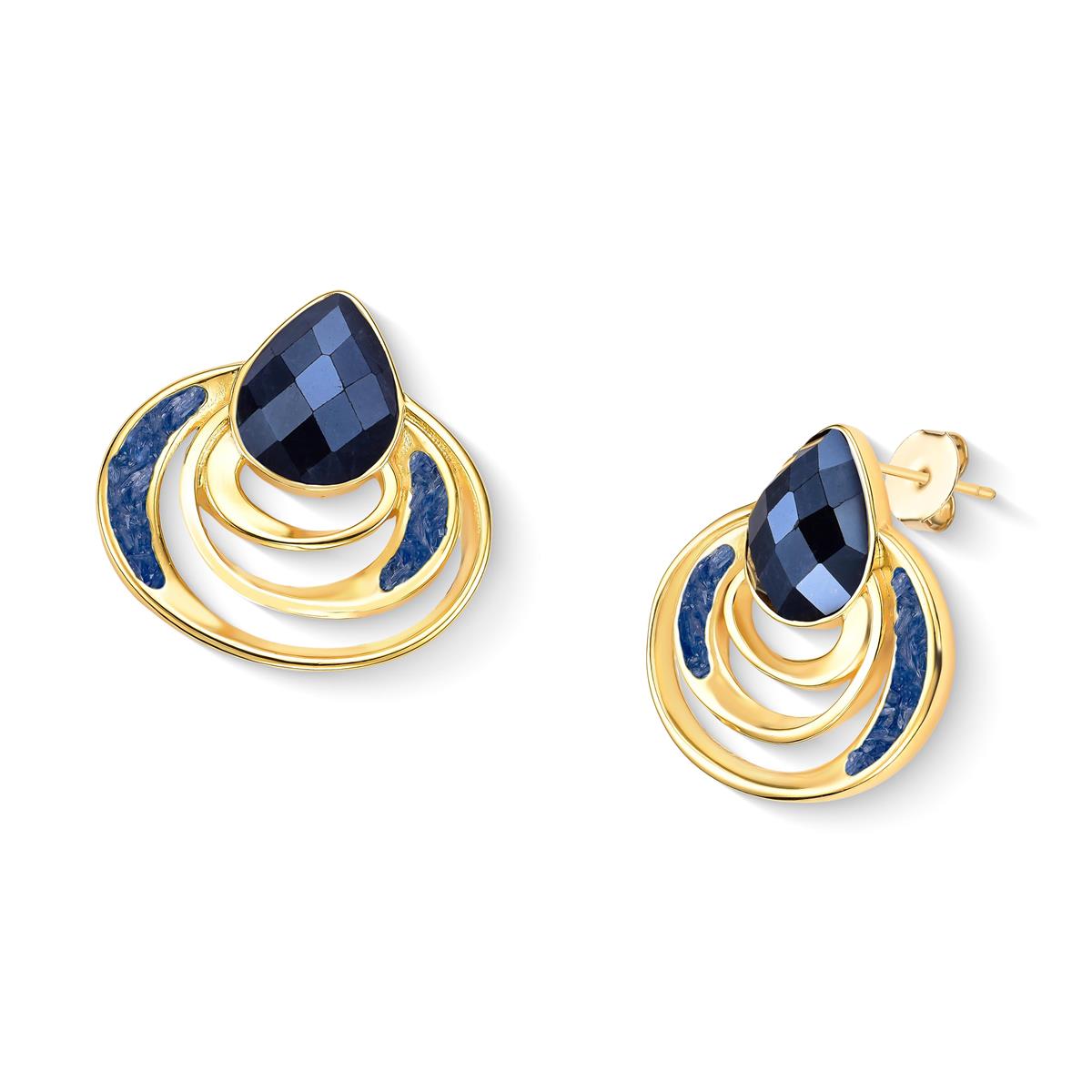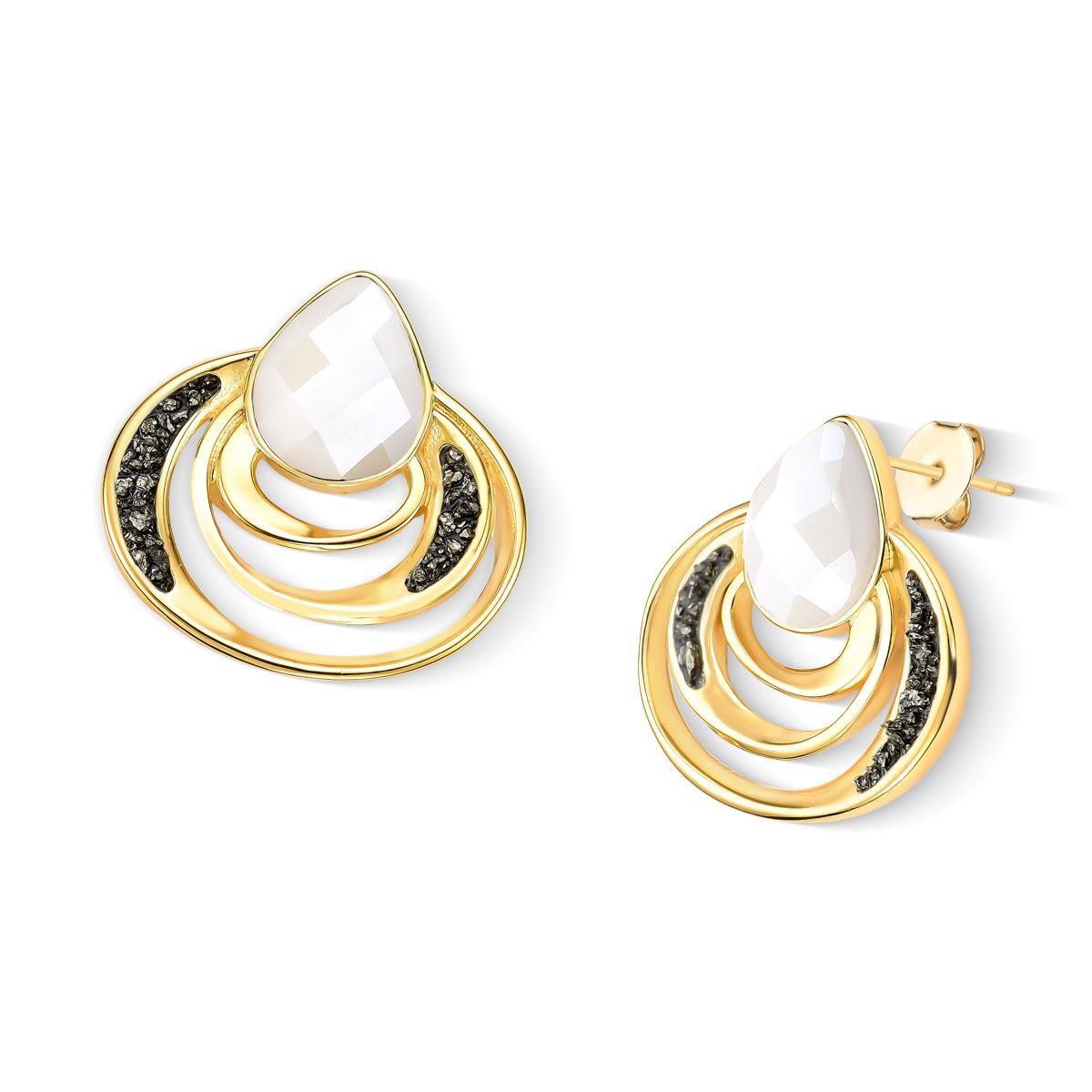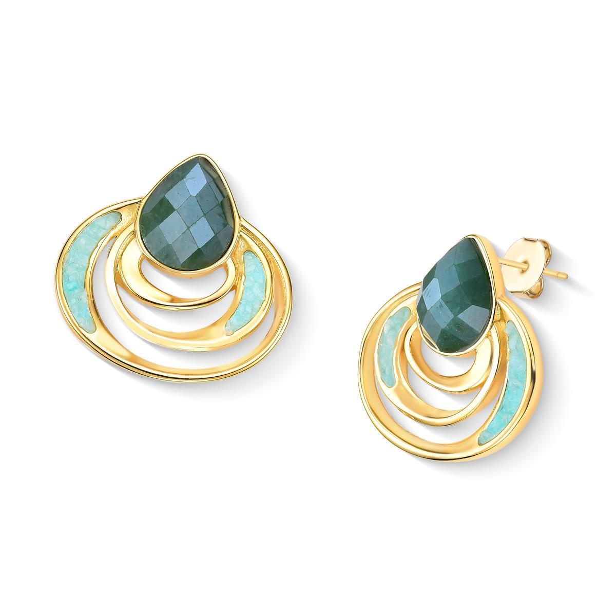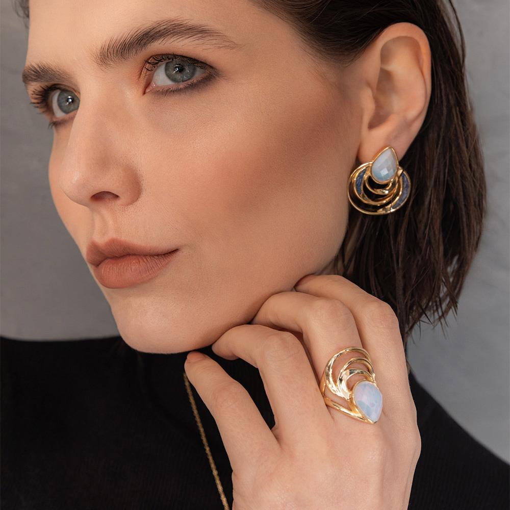 BRINCO FOLHEADO A OURO - COLEÇÃO ACQUA LUNA Peça de 3,1cm de altura que combina elegância e significado. Apresenta pedra facetada em formato de gota (10x14mm) complementada por detalhes em pedras fragmentadas que capturam a luz com refinamento. Inspirada na fluidez das águas e no brilho lunar, esta coleção traduz a sensibilidade do oceano em design contemporâneo.