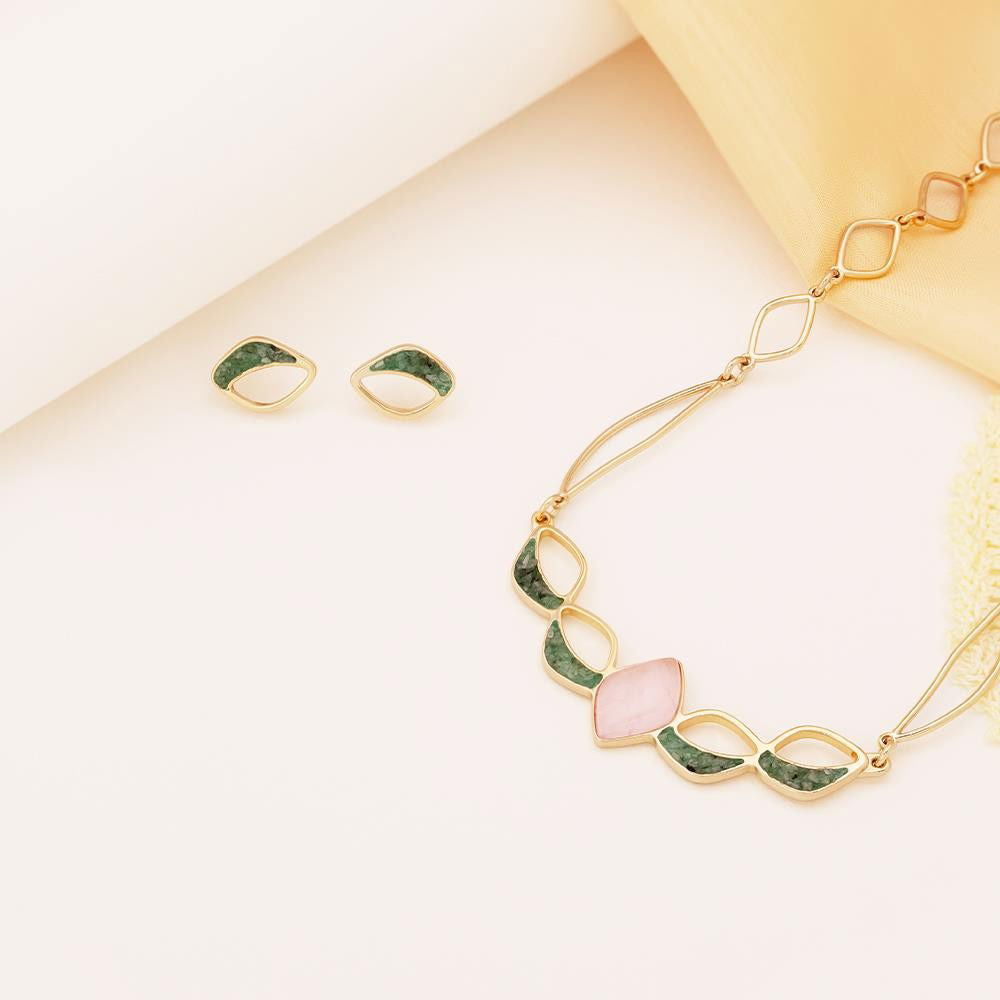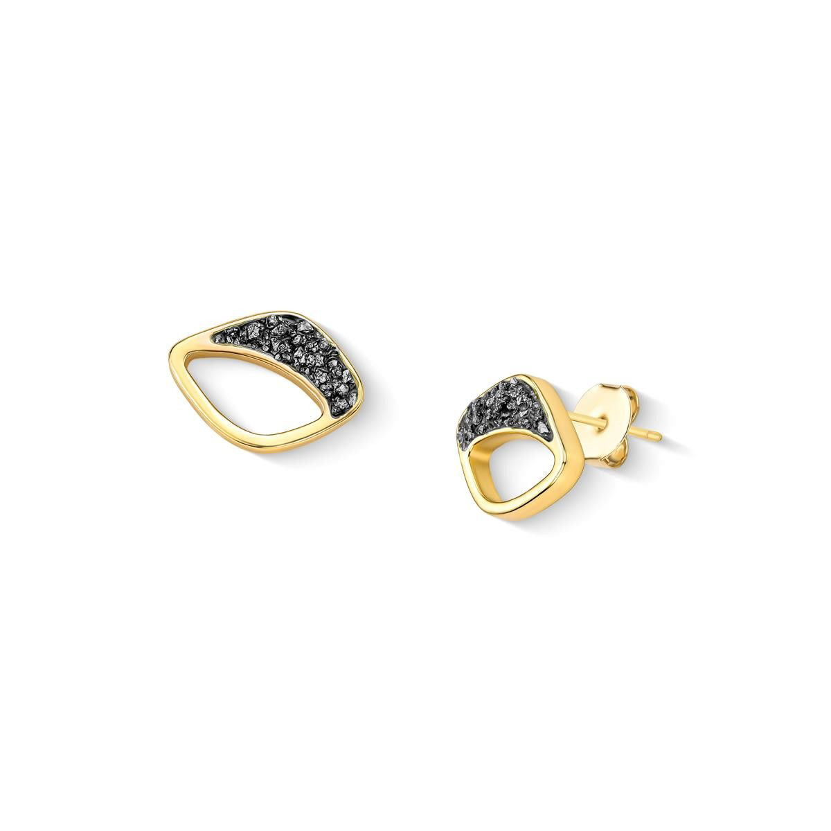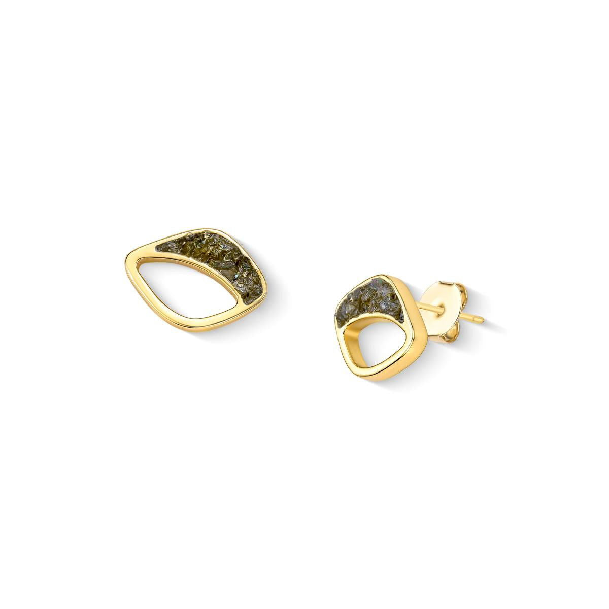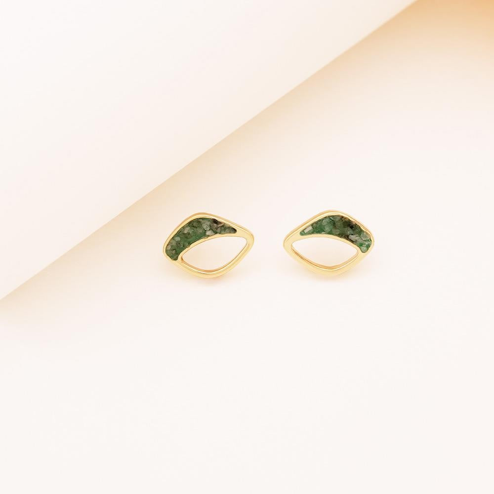 Brinco folheado a ouro da Coleção Aura, com 1,4cm de altura. Apresenta pedra cabochão em formato de folha (14x21mm) e detalhes em pedras fragmentadas que refletem luz de forma orgânica. A coleção une porcelana perolada, concha nautilus e texturas naturais em uma interpretação moderna do boho chic.