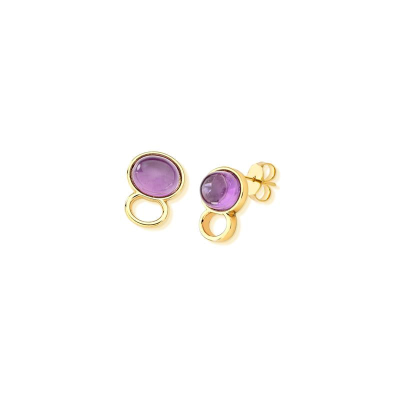 Brinco folheado a ouro da Coleção Ametista, apresentando pedra cabochão oval de 8x10mm com detalhes vazados na base. A ametista é reconhecida por suas propriedades energéticas associadas à sabedoria, equilíbrio e proteção espiritual, atuando como facilitadora entre planos físico e astral.