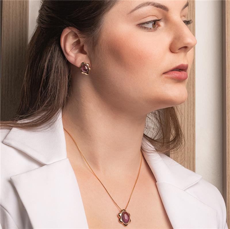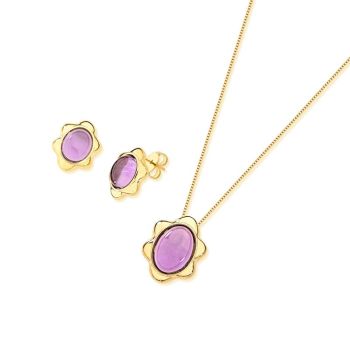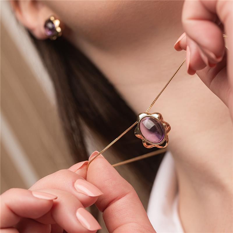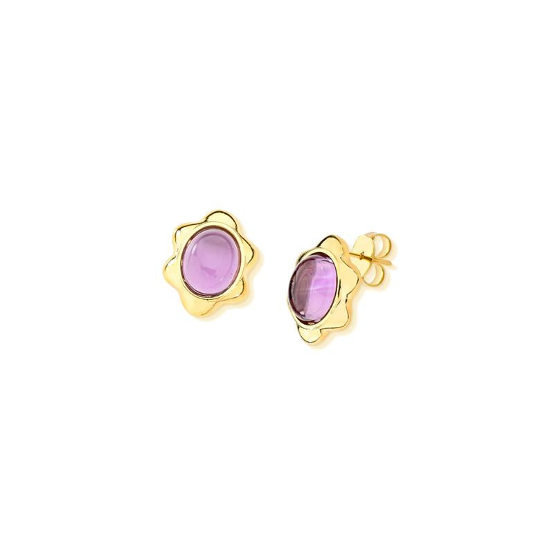 Brinco folheado a ouro da Coleção Ametista, apresentando pedra cabochão oval de 8x10mm envolvida por detalhes florais delicados no metal. A ametista é reconhecida por suas propriedades energéticas associadas à sabedoria, equilíbrio e proteção espiritual, atuando como facilitadora entre planos físicos e astrais.