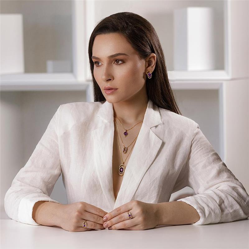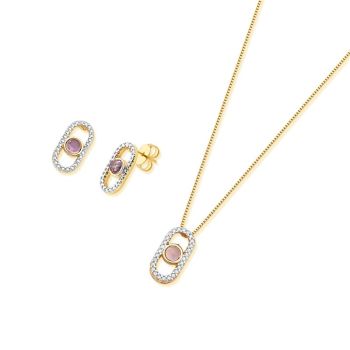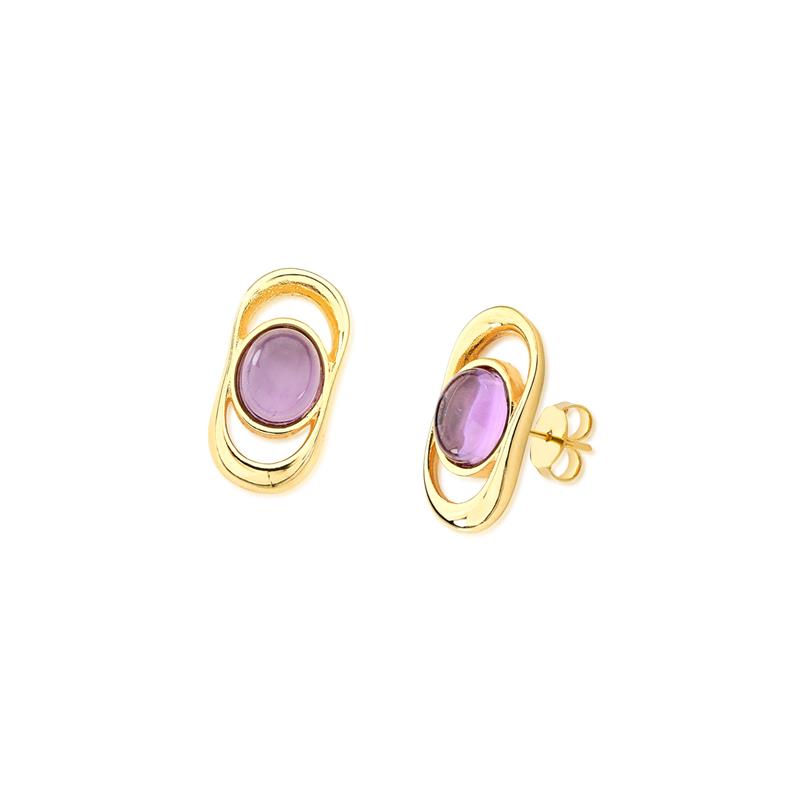 Brinco folheado a ouro da Coleção Ametista, apresentando pedra cabochão oval 8x10mm envolvida por metais vazados que conferem modernidade e sofisticação. A ametista é reconhecida por suas propriedades de sabedoria, equilíbrio e proteção espiritual, atuando como ponte entre o físico e o astral.