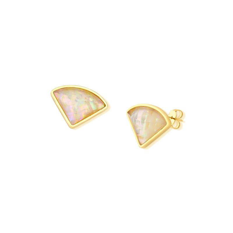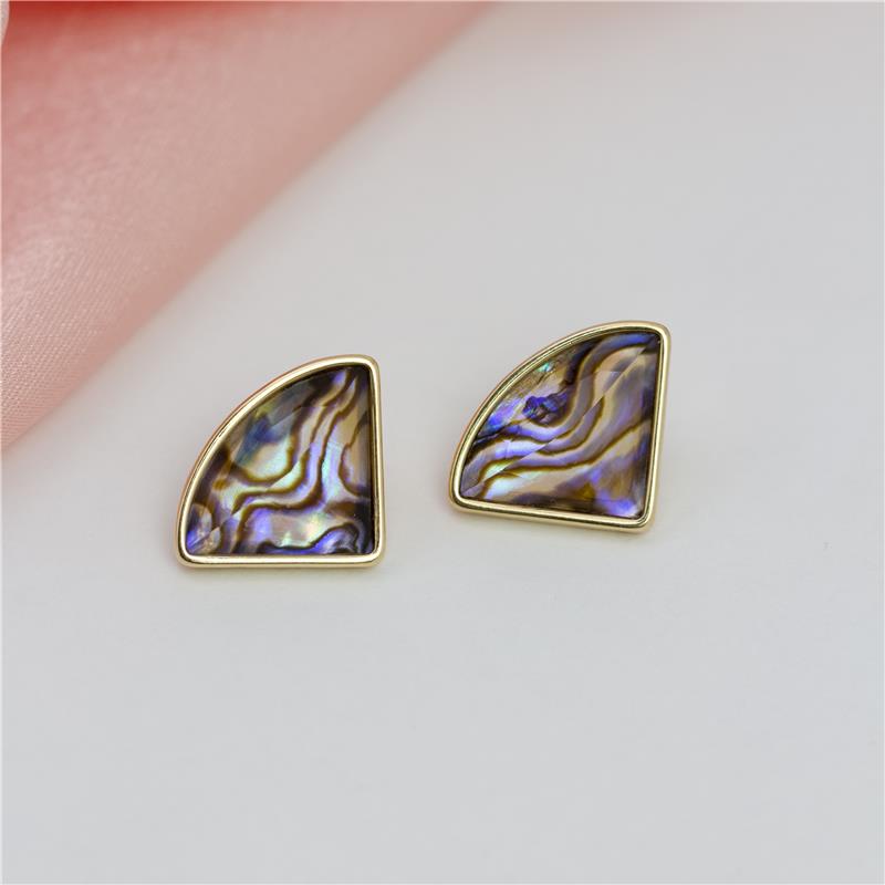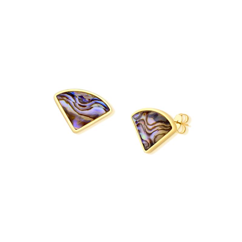Descubra a elegância do mar em cada movimento. Nosso brinco folheado a ouro da Coleção Conchas traz a sofisticação de uma pedra natural em formato de triângulo facetado (13x18mm), capturando a luminosidade única do abalone ou opala do mar.