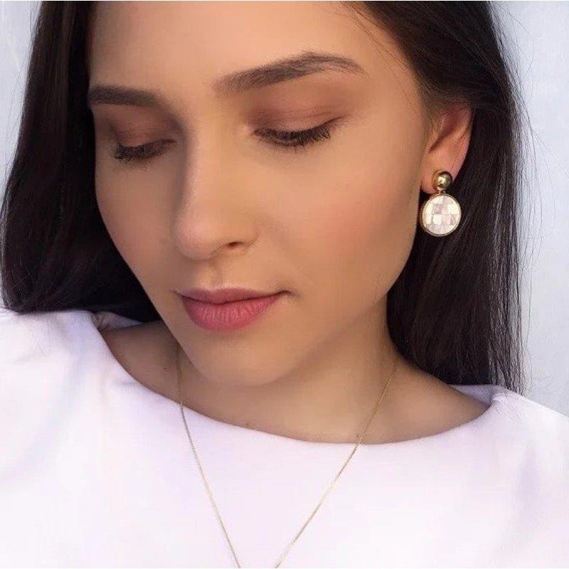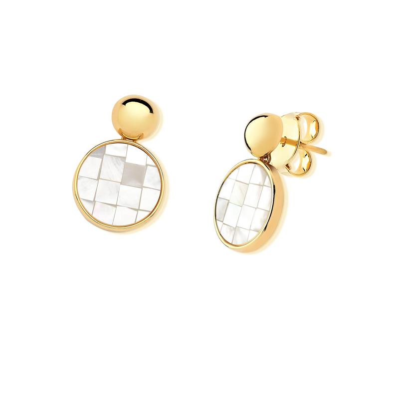 Brinco folheado a ouro com mosaico de madrepérola, peça exclusiva da Coleção Mosaico.