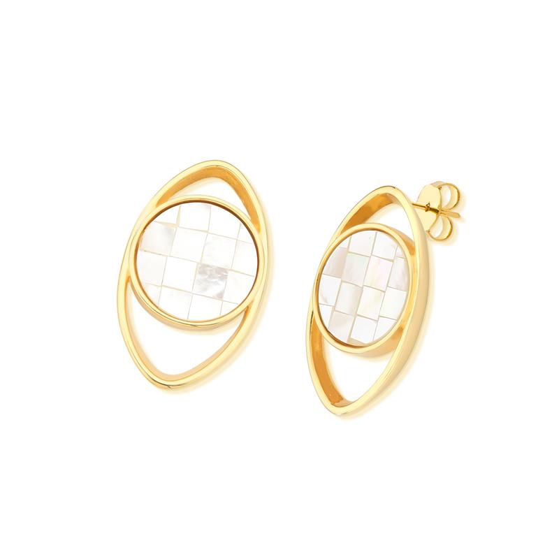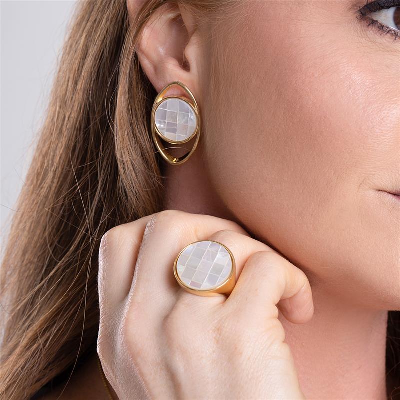 Brinco folheado a ouro da Coleção Mosaico, um acessório que combina elegância e sofisticação. Com altura de 3,5cm e pedra mosaico madre redonda de 17mm, este brinco apresenta um design refinado que valoriza o rosto.
