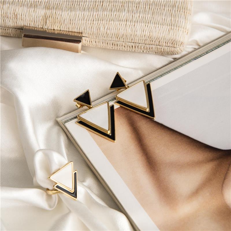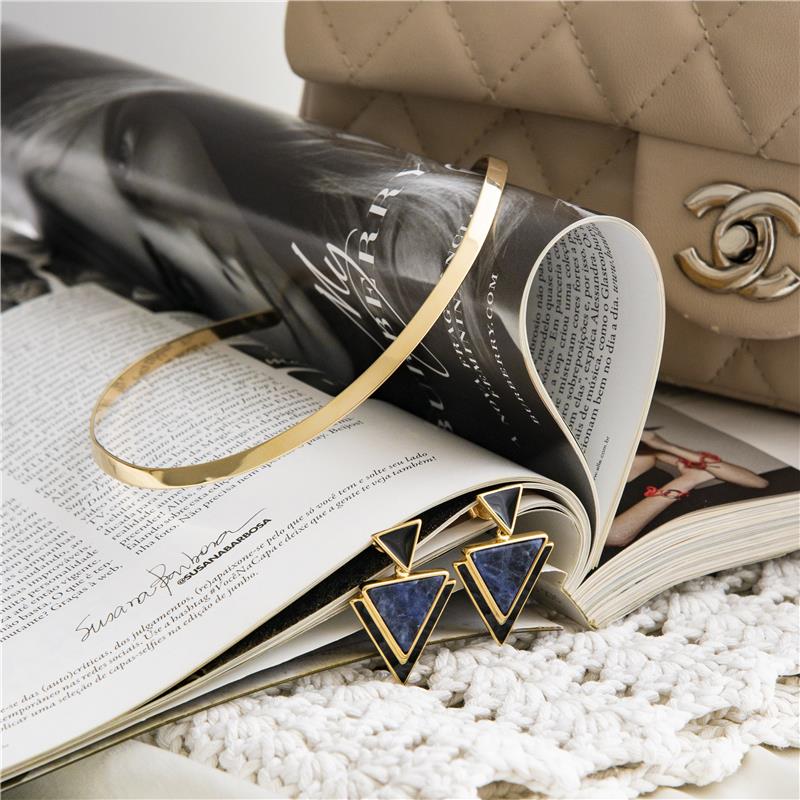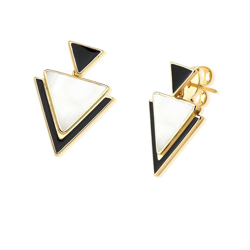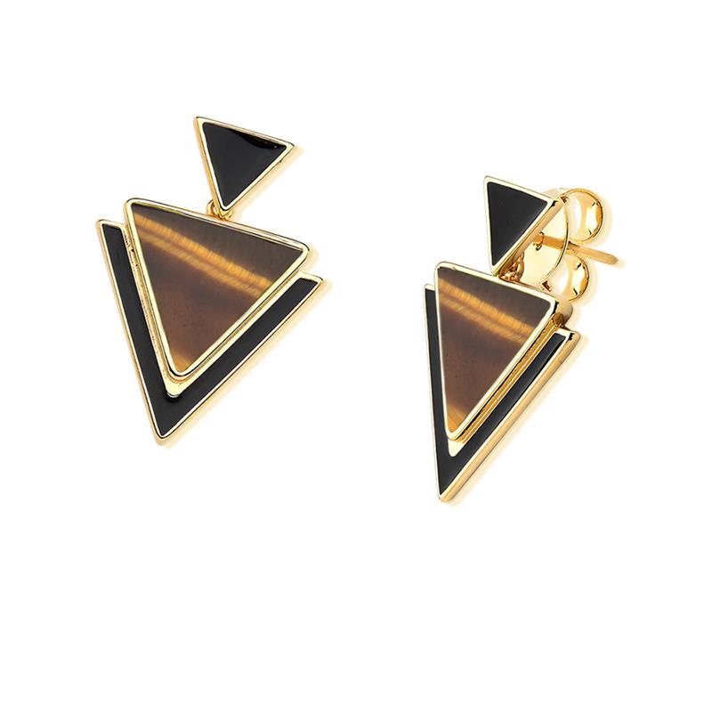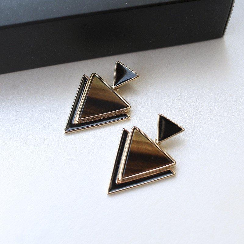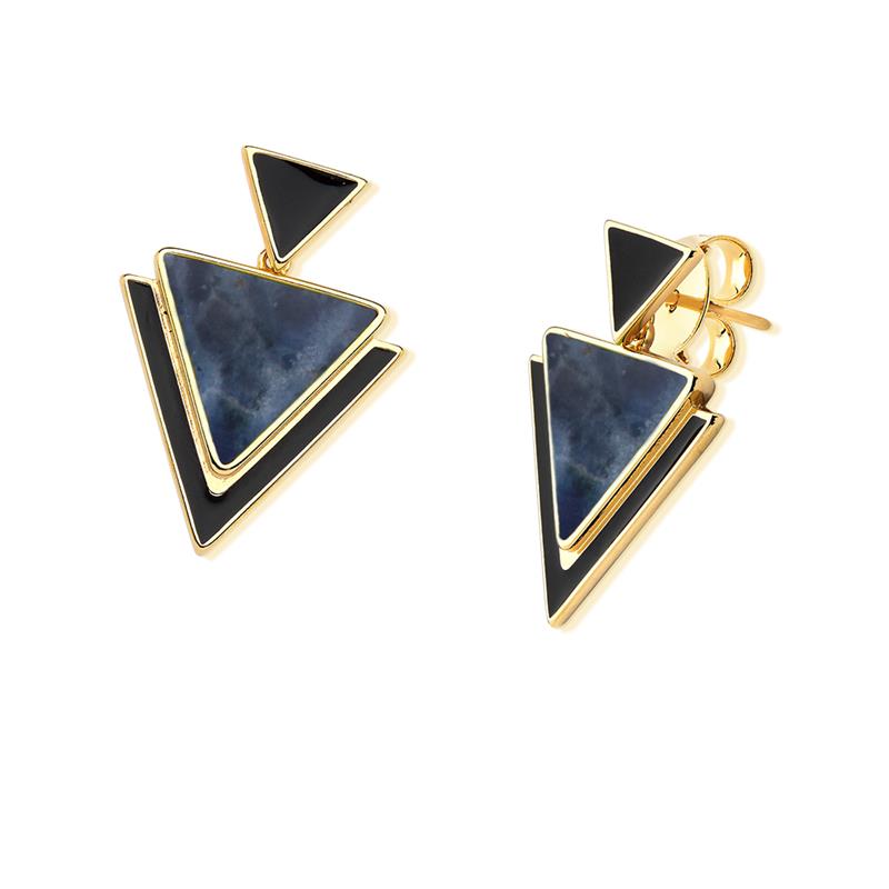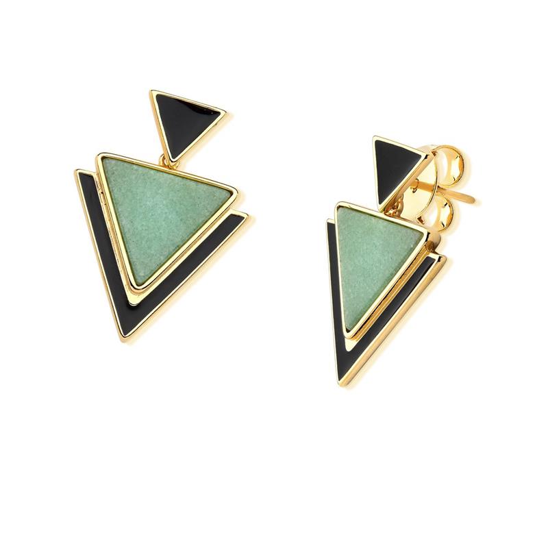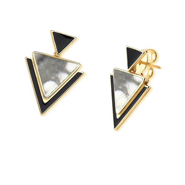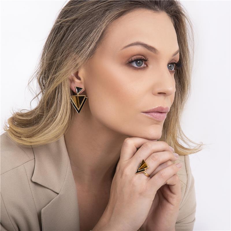 Brinco folheado a ouro com design exclusivo e sofisticado. Apresenta detalhes esmaltados que conferem elegância e personalidade à peça, complementados por uma pedra em formato triangular de 20 mm.