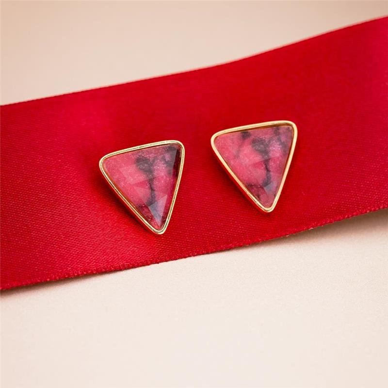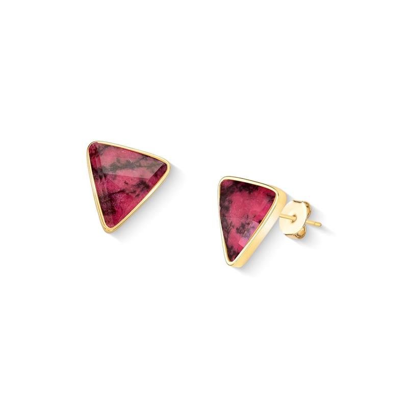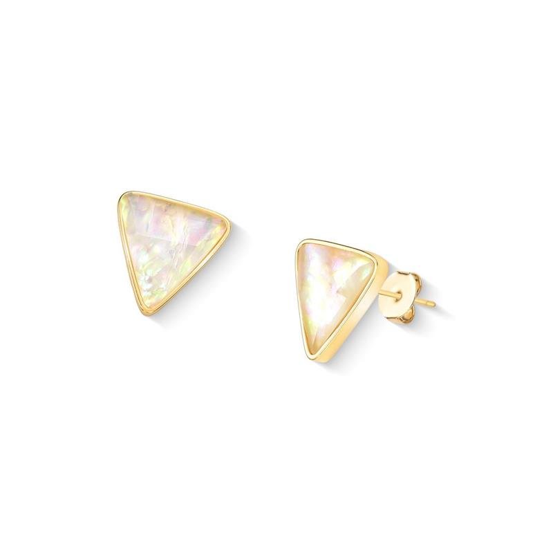 Brinco Folheado a Ouro da Coleção Radiante, com altura de 2,4cm e pedra facetada triangular de 15x16mm. Cada peça equilibra o clássico e o contemporâneo através de volumes projetados e formas geométricas marcantes.