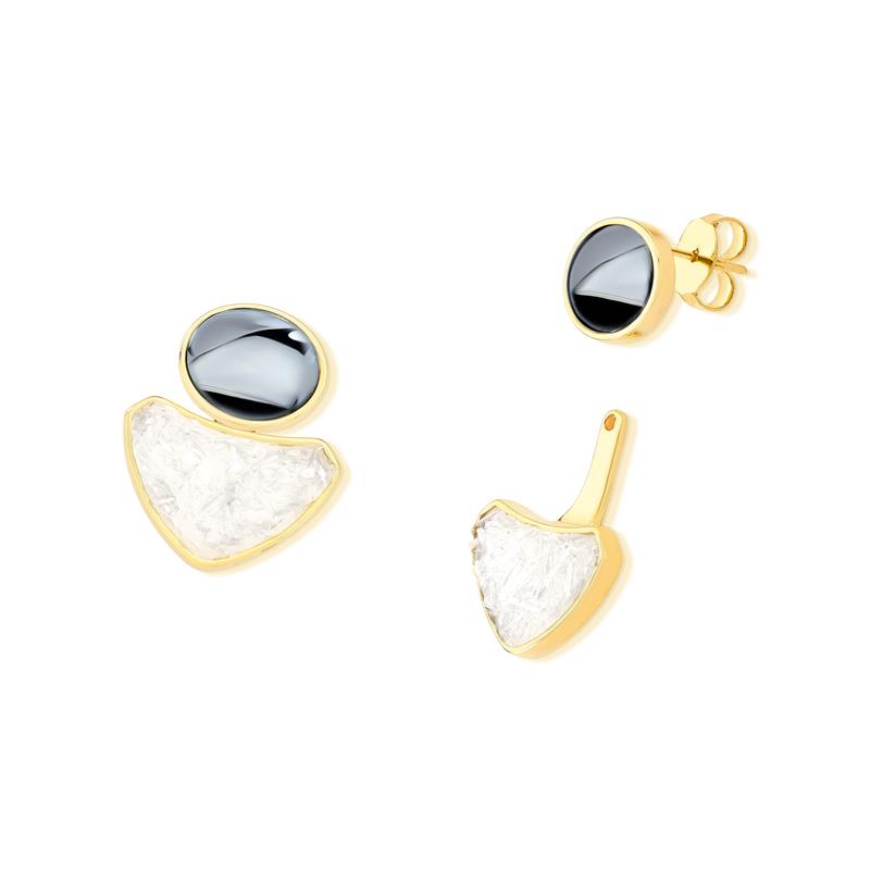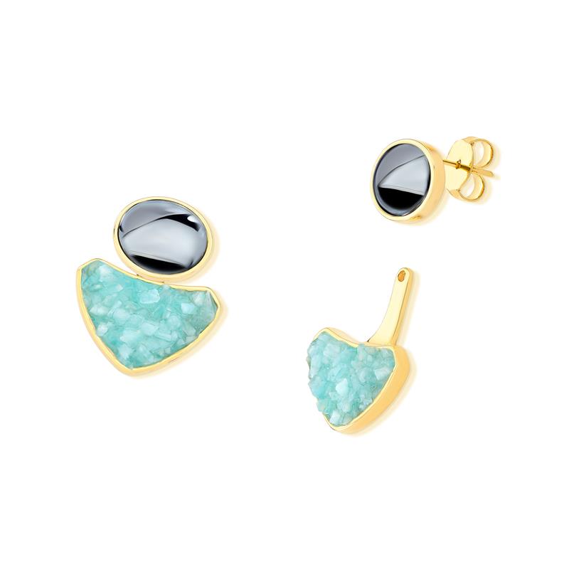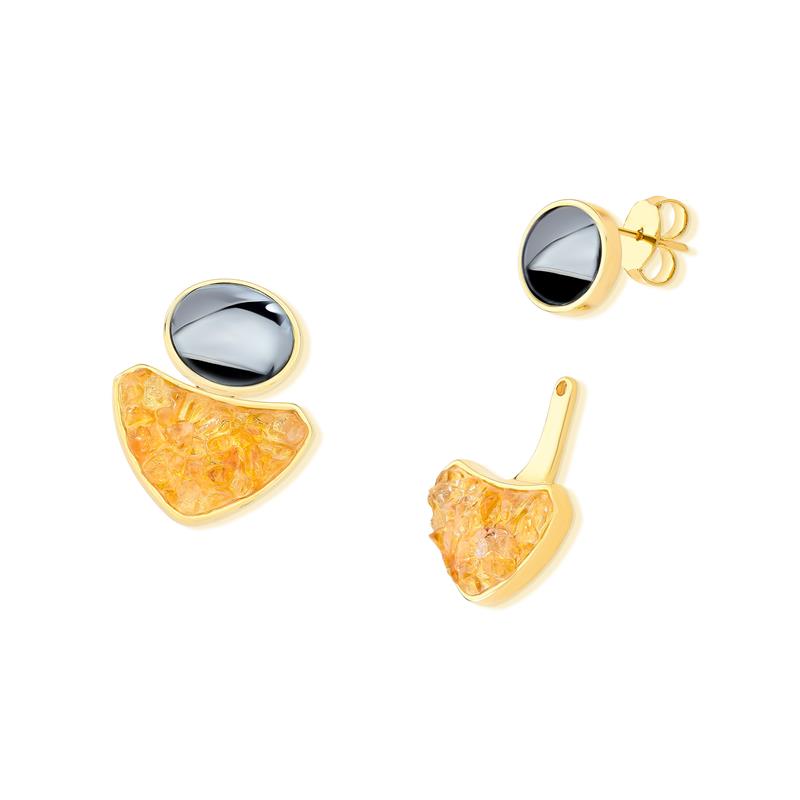Peça versátil da Coleção Equilíbrio, este brinco folheado a ouro apresenta design modular com pedra cabochão oval (10x12mm) e componente inferior destacável, permitindo duas configurações distintas. Com 2,7cm de altura, combina funcionalidade e elegância para o uso cotidiano ou ocasiões especiais.
