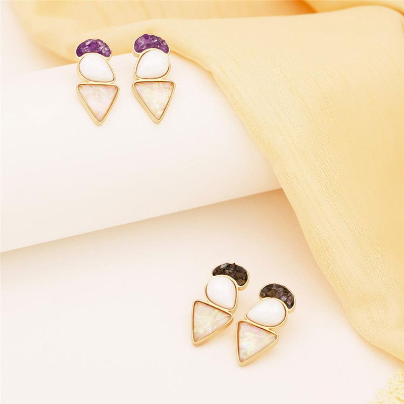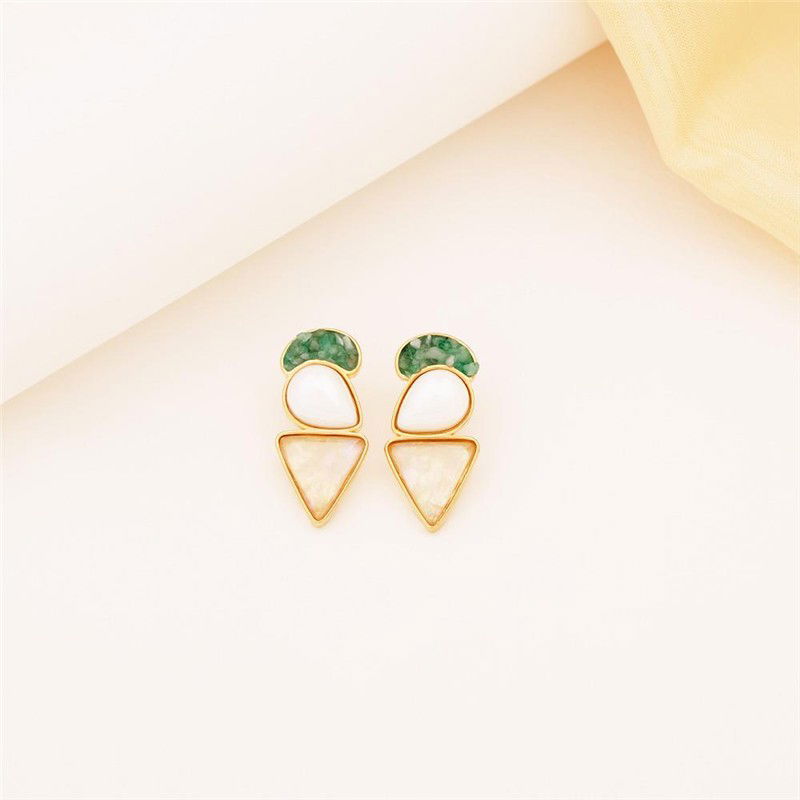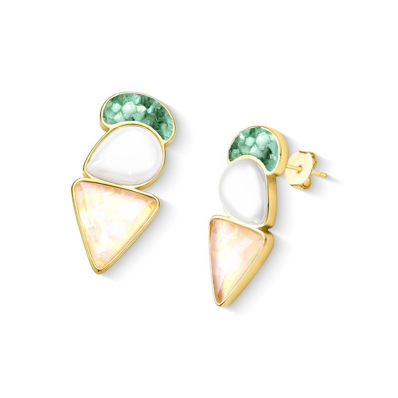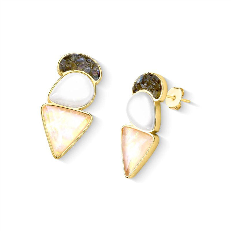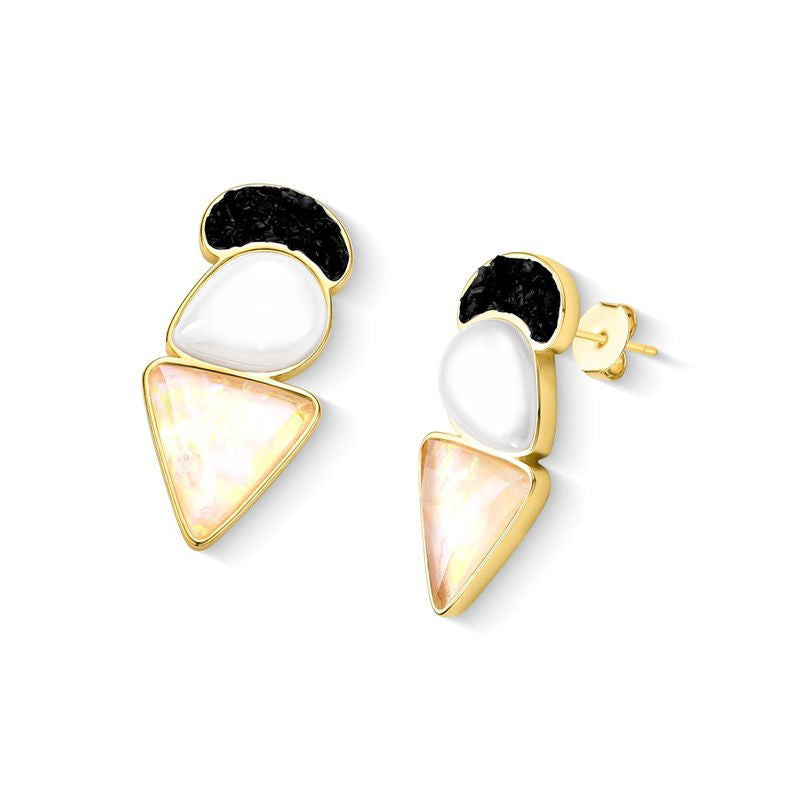 COLEÇÃO AURA – Brinco Folheado a Ouro Elegância boho reinventada em detalhes precisos. Com 3,8cm de altura, este brinco combina pedra facetada triangular (15x16mm) e cabochão perolado (10x14mm) em uma composição que reflete luz através de texturas orgânicas.