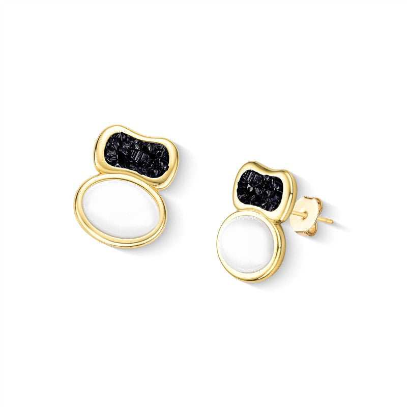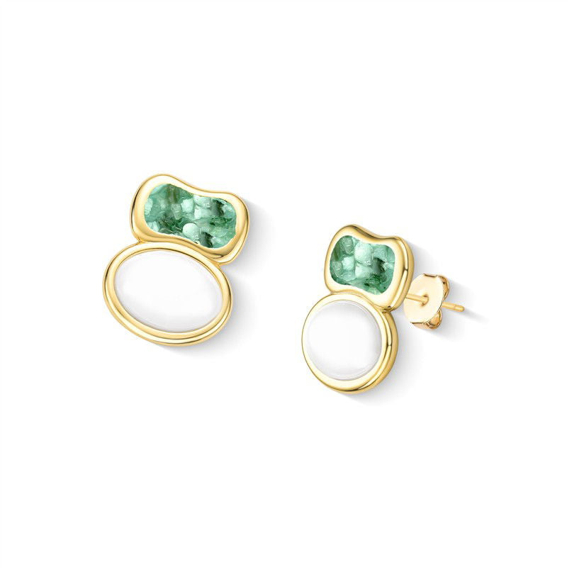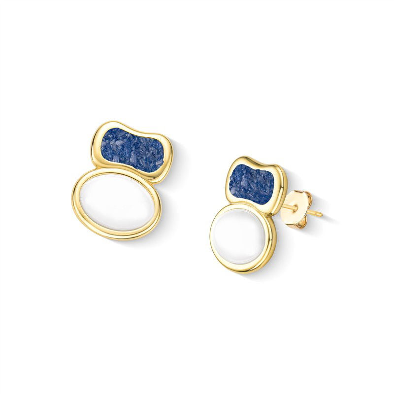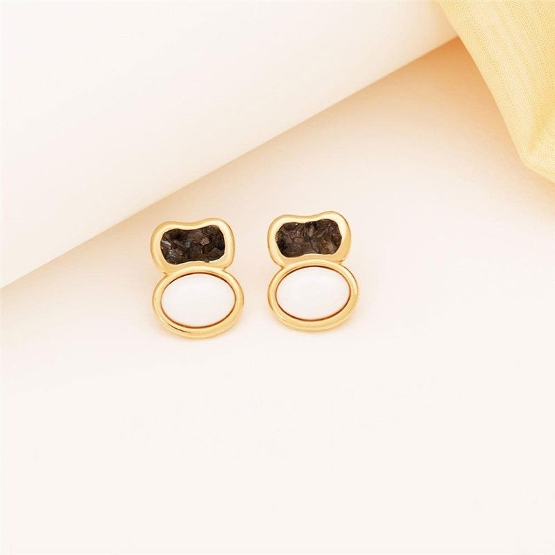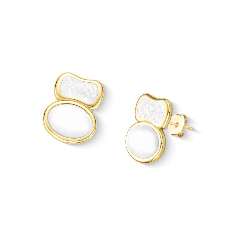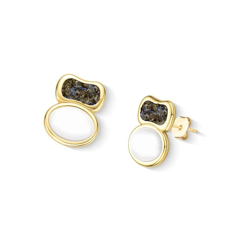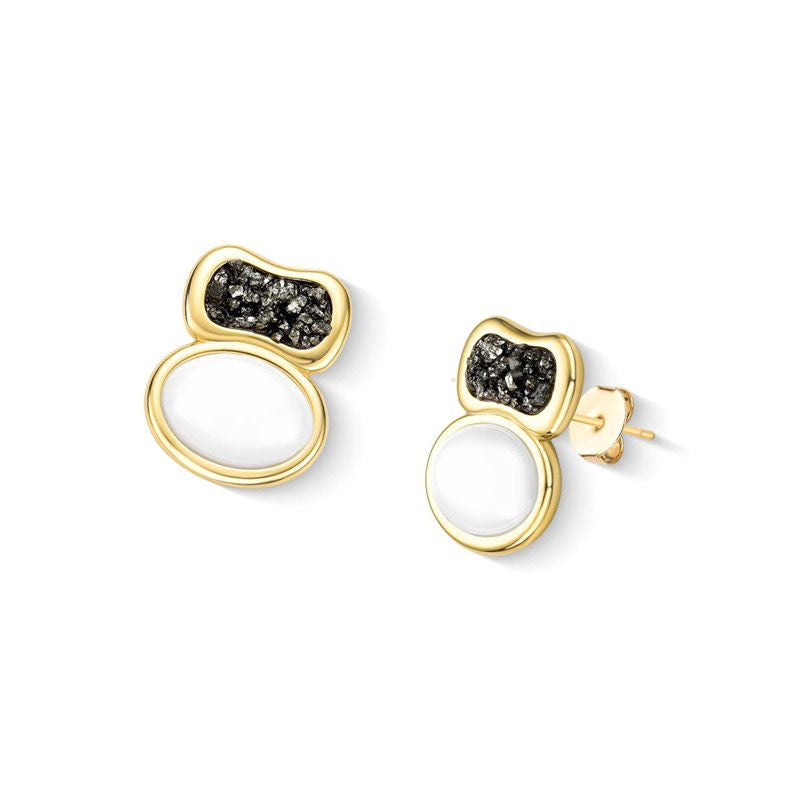 Brinco folheado a ouro da Coleção Aura, com altura de 2,4cm e acabamento em pedra cabochão oval (10x12mm). Inspirado na estética boho contemporâneo, combina porcelana perolada, detalhes em concha nautilus e pedras fragmentadas que capturam luz em formas orgânicas.