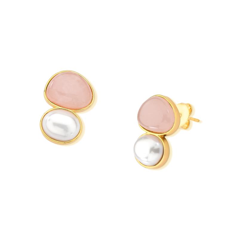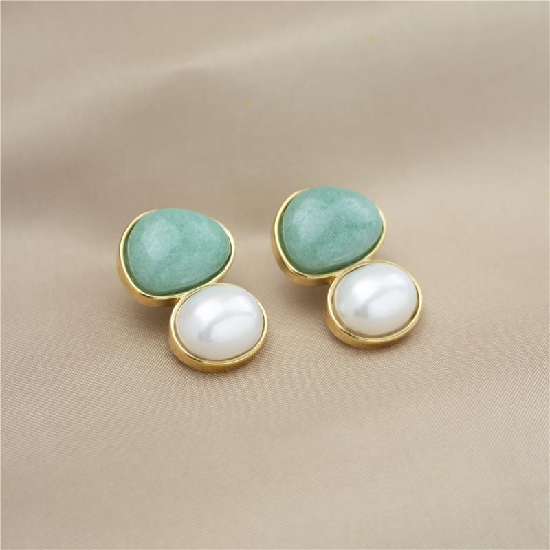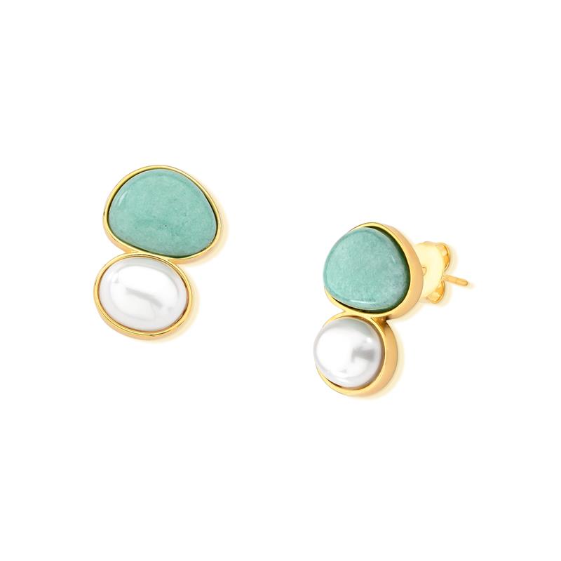 Pertencente à COLEÇÃO FUSÃO, este brinco folheado a ouro combina elegância clássica com materiais nobres. Com 2,7cm de altura, apresenta um cabochão em pedra natural (escudo 12x15mm) harmoniosamente pareado com uma pérola shell oval (10x12mm).