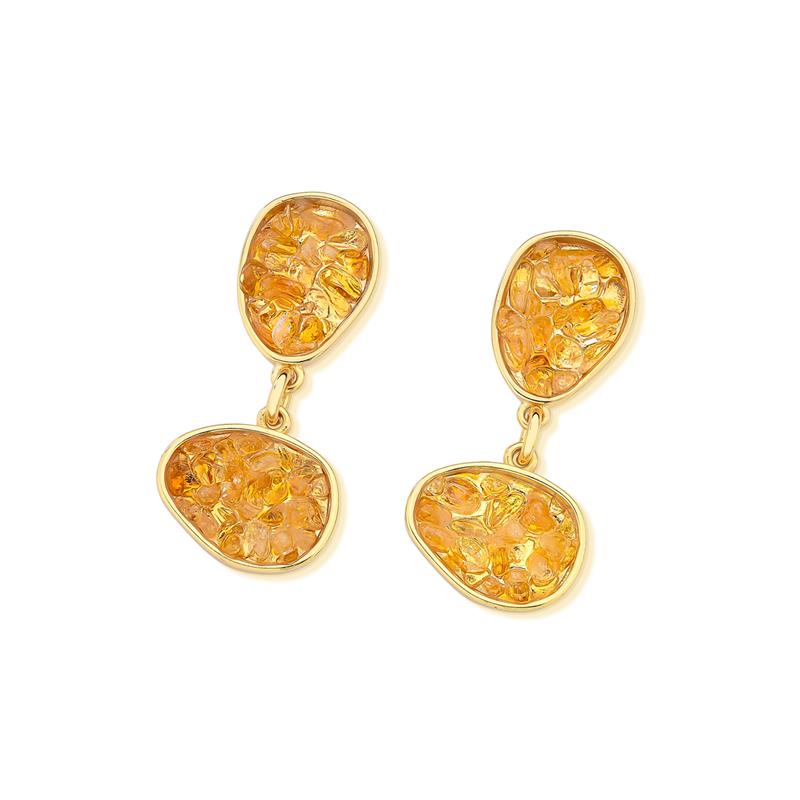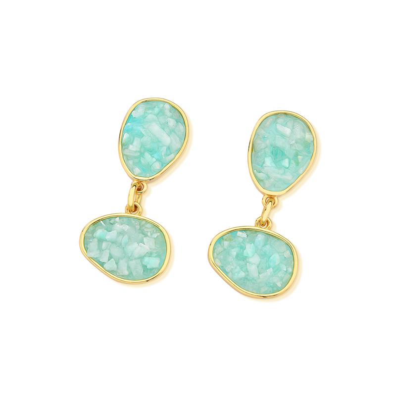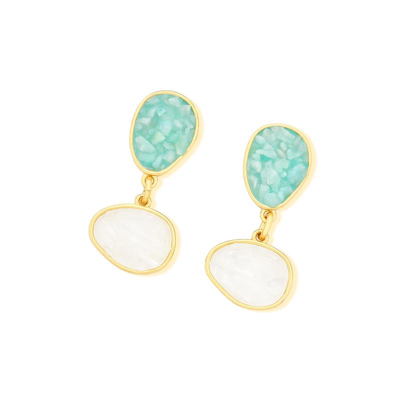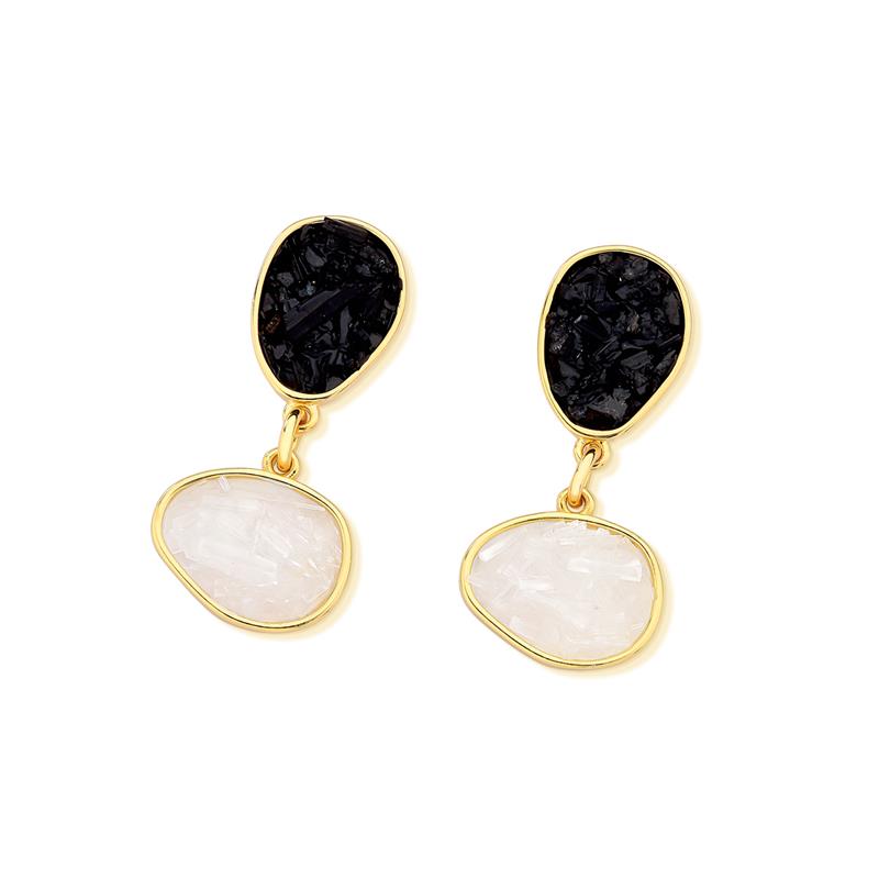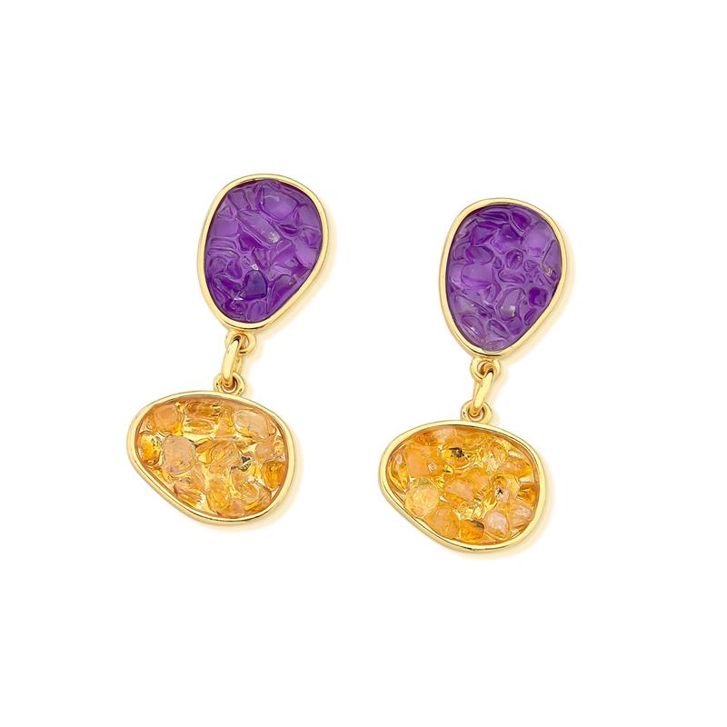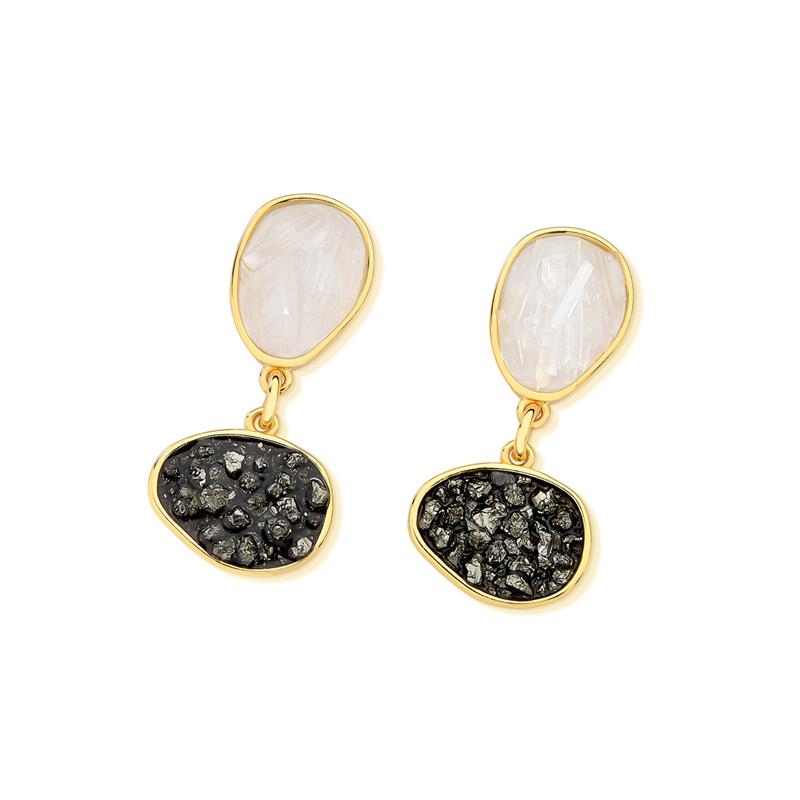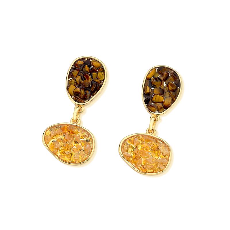 Peça integrante da Coleção Fragmentos, este brinco folheado a ouro apresenta 4cm de altura e design singular. Cada exemplar combina pedras em tons e formatos variados, garantindo originalidade.