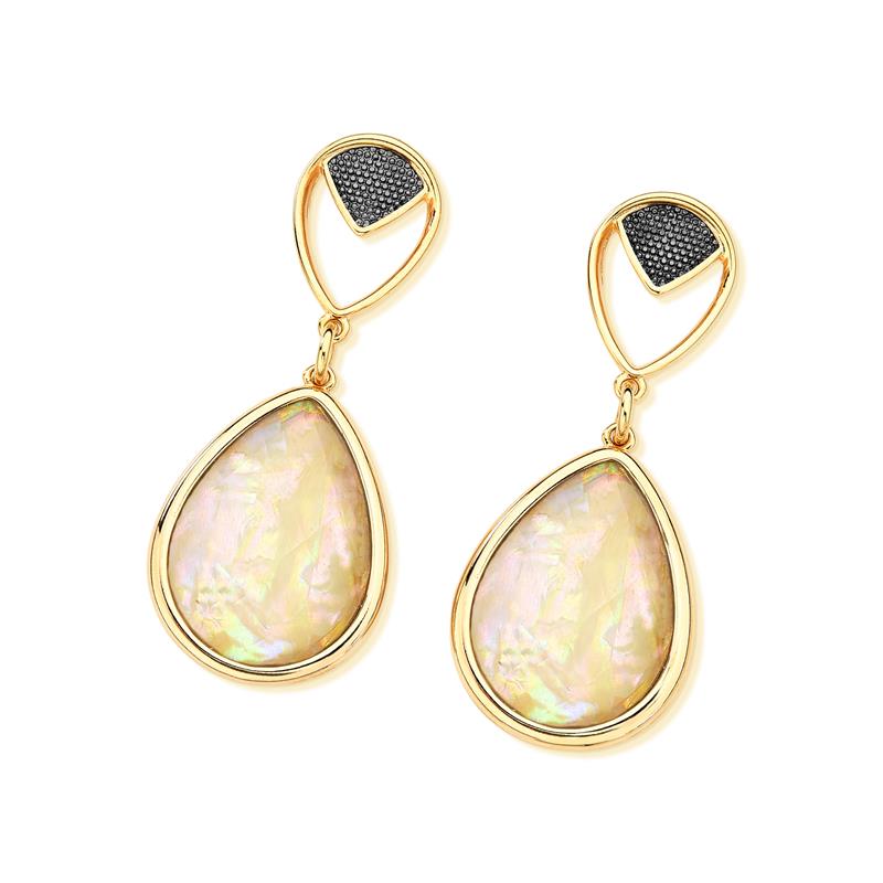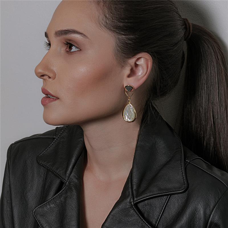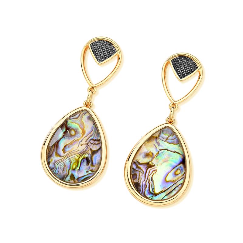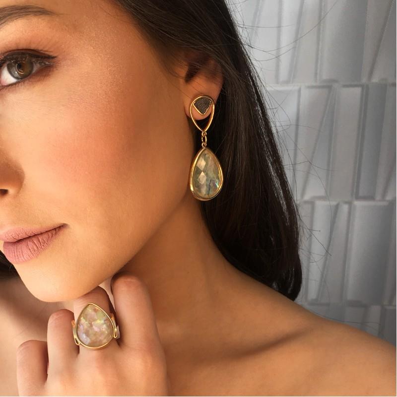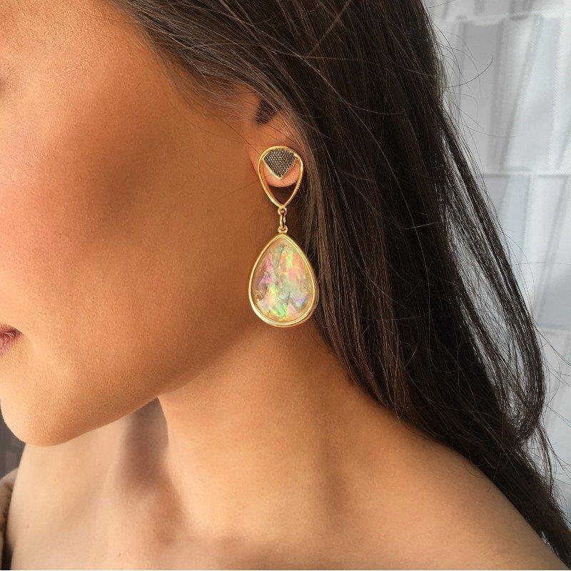 Brinco Folheado a Ouro e Ródio Negro com Pedra Nautilus e Opala do Mar Elegância sofisticada em cada detalhe. Este brinco combina o brilho quente do ouro com a profundidade do ródio negro, criando um contraste visual irresistível. A pedra gota em nautilus e opala do mar (25x18mm) captura a luz de forma única, revelando tons que variam entre azuis, verdes e reflexos iridescentes — como se guardasse a essência do oceano.