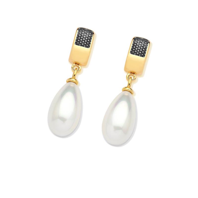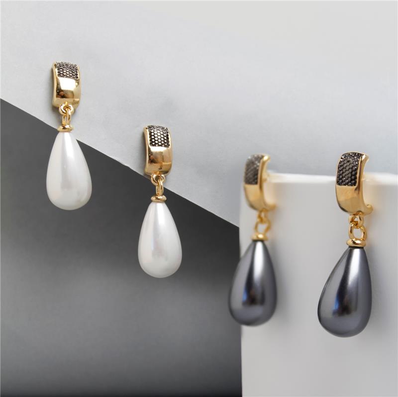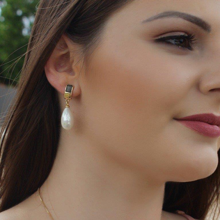 Estes brincos da coleção Pérolas combinam elegância clássica com design contemporâneo. Confeccionados em folheado a ouro com aplicação de ródio negro, apresentam pérolas de 10x18MM que conferem sofisticação e brilho natural. Com 4 cm de altura, proporcionam presença marcante sem comprometer o conforto, sendo ideais para ocasiões especiais ou uso cotidiano refinado.