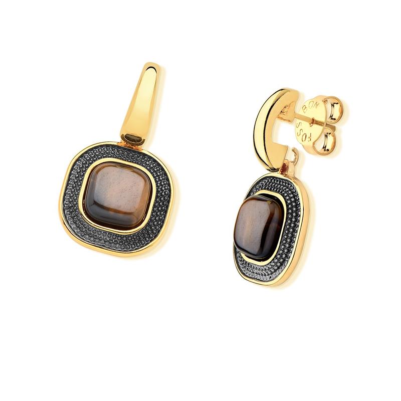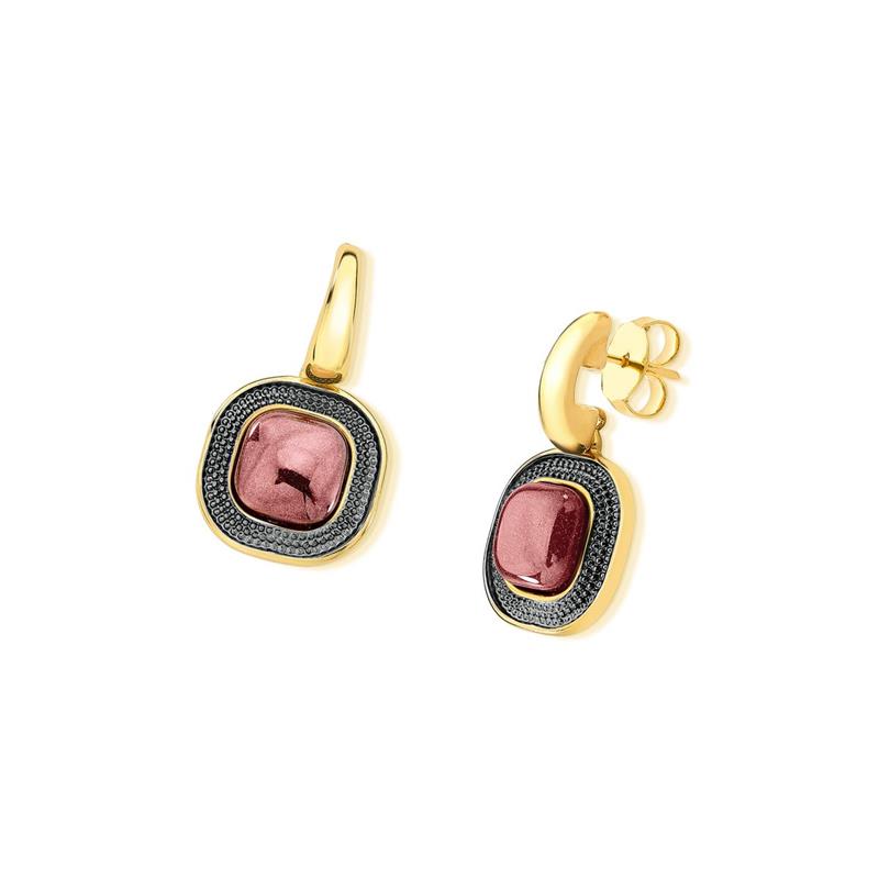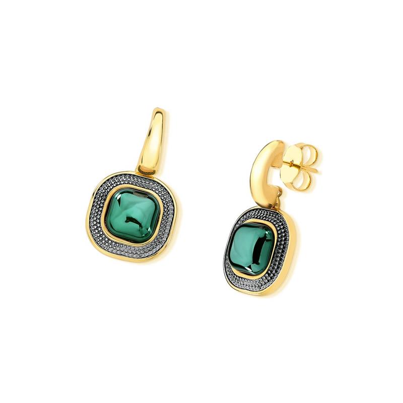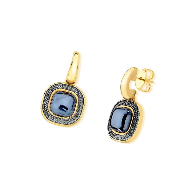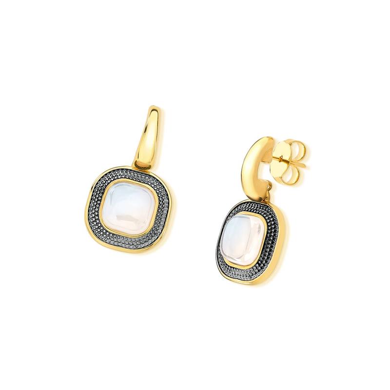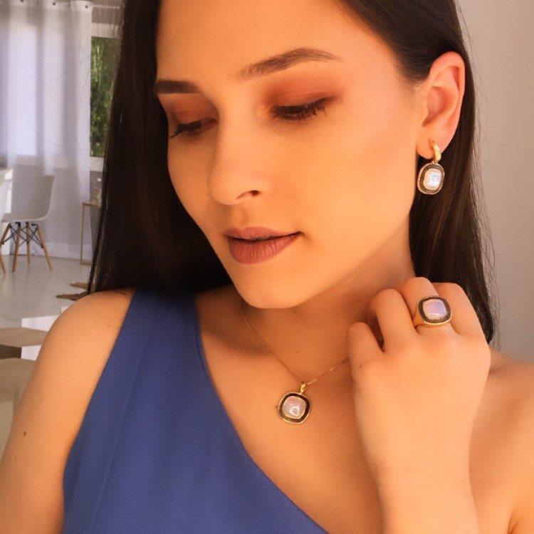 Brinco folheado a ouro com acabamento em ródio negro, que confere sofisticação e contraste elegante. Apresenta pedra quadrada de 10MM com efeito perolado, criando um brilho suave e refinado.