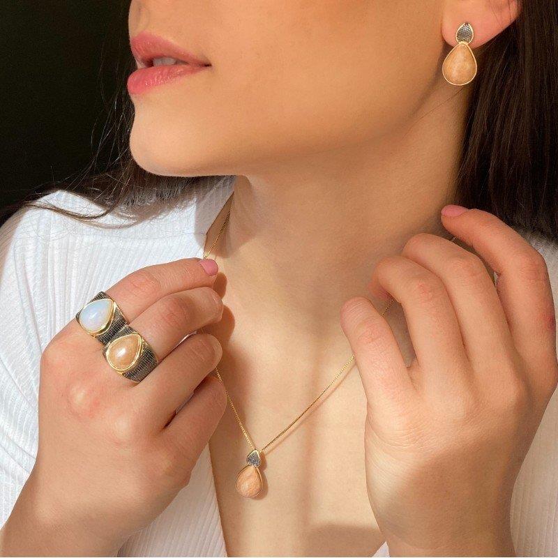O contraste entre o brilho do ouro folheado e a profundidade do ródio negro cria uma composição visual sofisticada, enquanto o efeito perolado da pedra adiciona um toque de feminilidade e delicadeza. Ideais para quem busca peças versáteis que transitam entre diferentes ocasiões com estilo e refinamento.