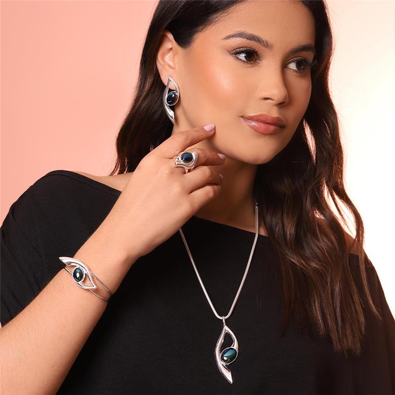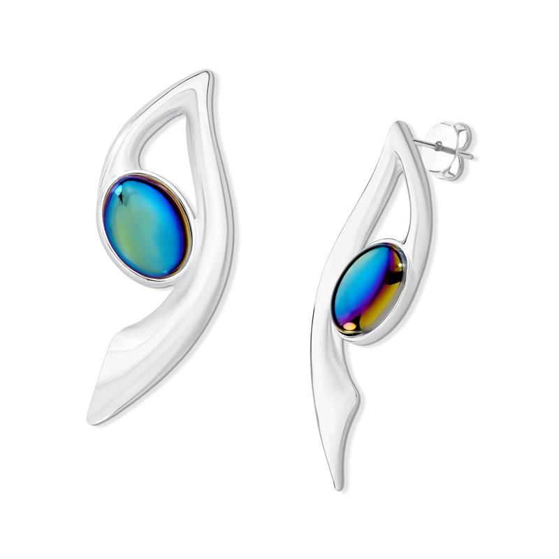 Brinco folheado a prata da Coleção Movimento, com altura de 5,3cm e pedra cabochão oval de 11x15mm. Uma peça que equilibra a atemporalidade do design clássico com toques contemporâneos, apresentando detalhes refinados e naturais.