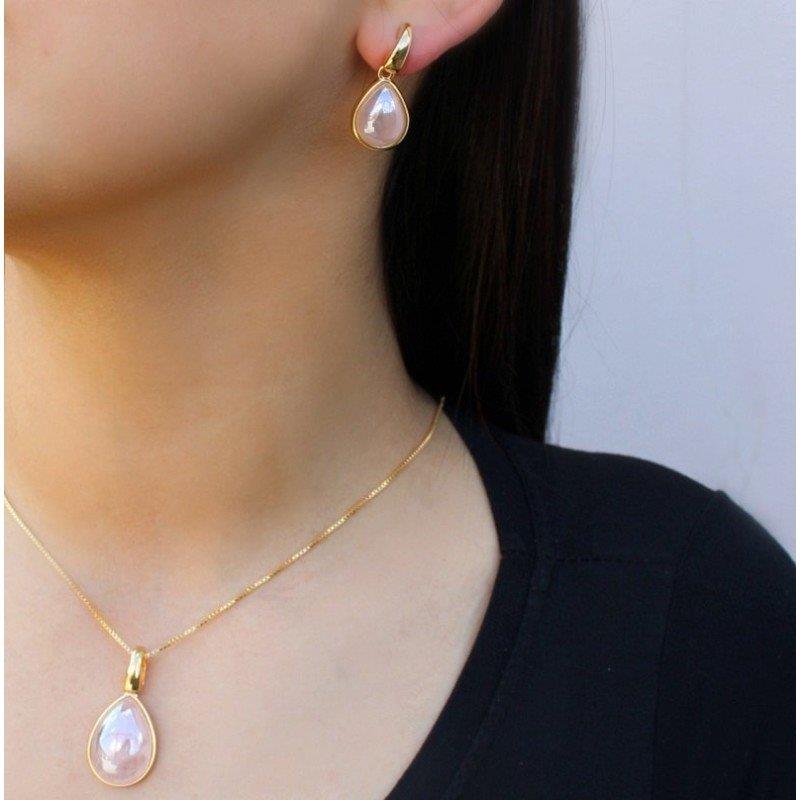 Elegância que brilha em cada movimento. Nosso brinco folheado a ouro combina o acabamento perolado sofisticado com uma pedra natural em corte gota de 10x14mm, criando um acessório que captura luz e atenção. A pedra natural traz autenticidade e exclusividade, cada peça é única.