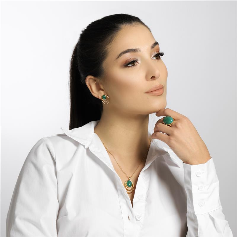 Conjunto folheado a ouro que une elegância e versatilidade. Composto por brinco, pingente e corrente, apresenta pedras oval cabochão que conferem sofisticação discreta.