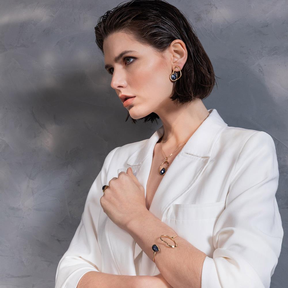 A pedra facetada em gota (10x14mm) reflete a luz como o brilho lunar sobre o mar, enquanto a corrente Cartier de 43cm + 7cm de extensor oferece versatilidade e conforto. Com brinco de 3,2cm e pingente de 4,3cm, as proporções são elegantes e equilibradas.