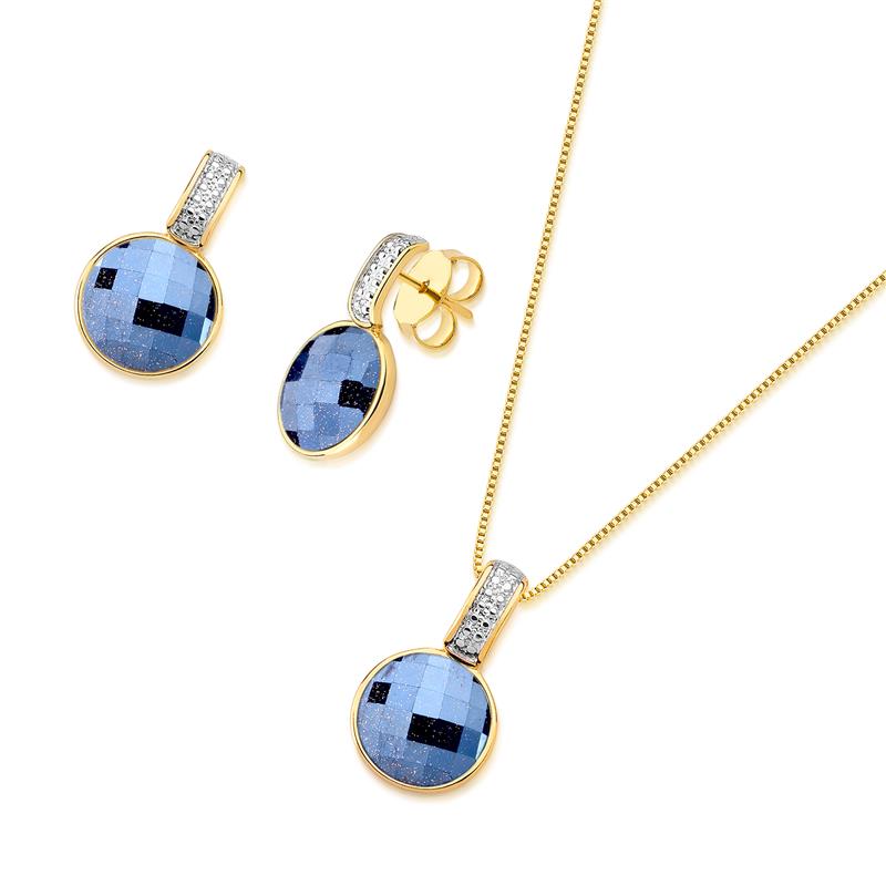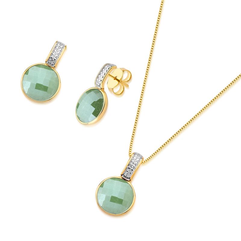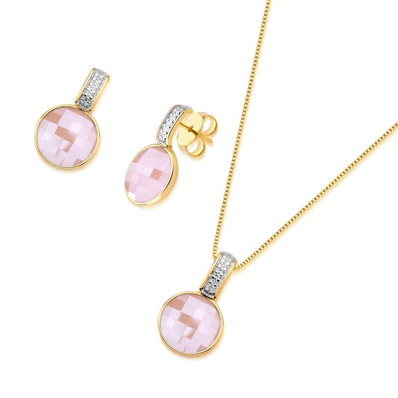 O conjunto é composto por brinco com pedra natural facetada, com efeito perolado, no formato redondo de 12mm. Acompanha pingente de mesma pedra. Possui detalhes com aplicação de caneta de ródio branco. Corrente veneziana de 43cm + 7cm de extensor.