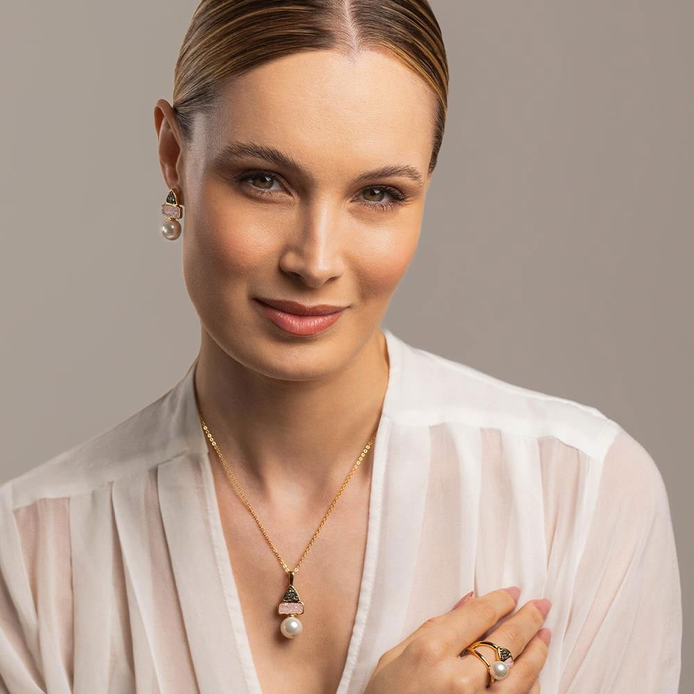 Descubra a elegância atemporal da Coleção Afeto. Este conjunto folheado a ouro reúne sofisticação e modernidade em perfeita harmonia. Brincos delicados de 3cm e pingente de 3,9cm em pérola shell natural de 12mm, complementados por detalhes em pedras fragmentadas que capturam luz de forma única.